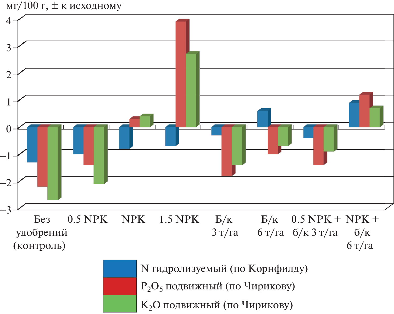 In a laboratory and field experiment conducted in the climatic conditions of the Moscow region, it was found that after 2 rotations (6 years) saturated vegetable crop rotation (late white cabbage – carrots – table beets) on alluvial meadow medium loamy soil with annual application of biocompost at a dose of 6 t/ha (total of 18 t/ha), the humus content in the soil stabilized, a tendency to accumulation of alkaline hydrolyzable nitrogen fraction (+6%) was noted and the consumption of mobile forms of phosphorus (–4%) and potassium (–6%), as well as soil decompression. The use of mineral fertilizers in single and one-and-a-half doses revealed a tendency to decrease the content of humus in the soil (by 3–4%), hydrolyzable nitrogen (by 7–8%) and the accumulation of mobile phosphorus (by 1–15%) and potassium (by 3–22%). The introduction of a low dose of mineral fertilizers led to a deterioration of soil fertility, a decrease in the content of humus (–5%), mobile phosphorus and potassium (by 5 and 17%). Slightly more effective was the introduction of biocompost annually at a dose of 3 t/ha. With the joint application of biocompost (6 t/ha) and a single dose of NPK, stabilization of the humus content in the soil at the initial level, accumulation of hydrolyzable nitrogen (by 9%), mobile phosphorus and potassium (by 5–6%) was noted. During 2 rotations, there was a decrease in the content of exchangeable calcium (by 1–10% from the initial level) and magnesium (by 3–11%) and weak acidification of the soil (a decrease in pHKCl by 1–2% from the initial indicator). It was found that the average productivity of arable land without the use of fertilizers was 50 t/ha, increased by 14 when the half dose was applied, by 28 when the single dose was applied, and by 42% when the half dose was applied, the use of biocompost at doses of 3 and 6 t/ha provided an increase in productivity by 8–16%. With the joint annual application of biocompost with a single dose of NPK, the average productivity of crop rotation increased by 26–35%.