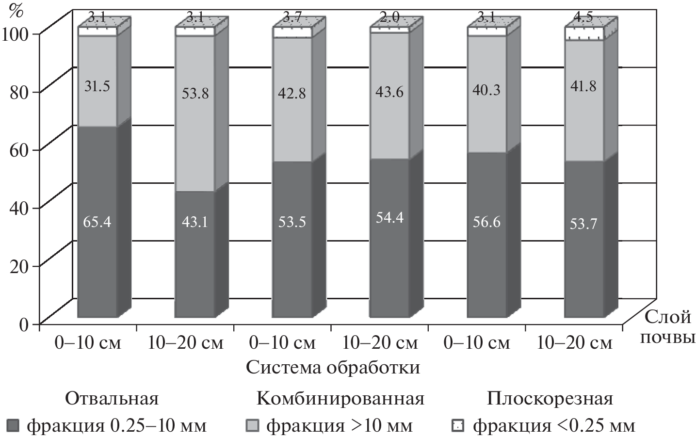 In a long-term stationary experiment on the basis of a 4-pole fruit-bearing crop rotation, the influence of processing methods with different levels of mechanical impact on the soil was studied: dump (plowing to a depth of 20–22 cm), combined (alternating plowing, plane-cutting processing (to a depth of 10–12 cm), without processing) and plane-cutting processing on the content of organic matter and the structural and aggregate composition of meadow-chernozem soil. It was found that a decrease in the intensity and depth of tillage with a combined and flat-cut system increased the humus content by 0.30 and 0.48% in a layer of 0–20 cm in comparison with dump treatment. The tillage system had a significant impact on the layer-by-layer distribution of labile organic matter in the form of mortmass. The largest stocks of mortmass in the arable layer were noted in the variant of the dump tillage system – 8.69 t/ha. On resource-saving backgrounds, a tendency to decrease the stocks of mortmass in the soil by 0.08–0.69 t/ha was revealed. The contribution of agronomically valuable structural units of 0.25–10 mm in size was 43.1–65.4 in layers, and the yield of large lumps and dust was 34.6–56.9% of the soil mass. The best structural condition of the soil is marked when using a dump treatment system. The presence of a close correlation between the stocks of mortmass in the soil layer of 0–20 cm and the content of structural-aggregate fractions with a size of 10–5 mm (r = 0.72 ± 0.11) and 5–3 mm (r = 0.68 ± 0.10) was established.