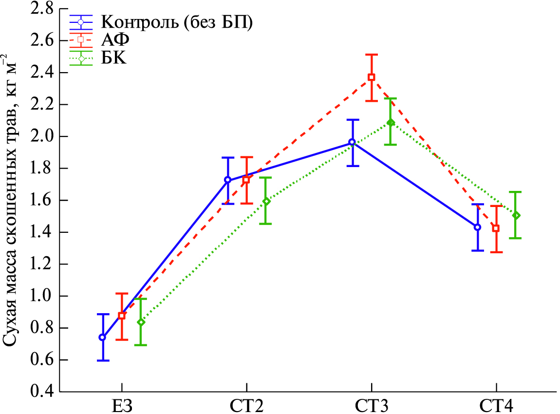 Биомасса сеяных трав в опыте была в 2–3 раза и существенно больше, чем в варианте ЕЗ, и достигала в среднем за 3 года 1.70 (вариант СТ2) и 2.99 (вариант СТ3) кг/м2. БП мало влияли на биомассу скошенных трав в большинстве вариантов задернения и только в варианте СТ3 + АФ существенно увеличивалась на 0.54 кг/м2 (22%) по отношению к СТ3К, что, вероятно, определялось ростстимулирующим действием этого препарата.