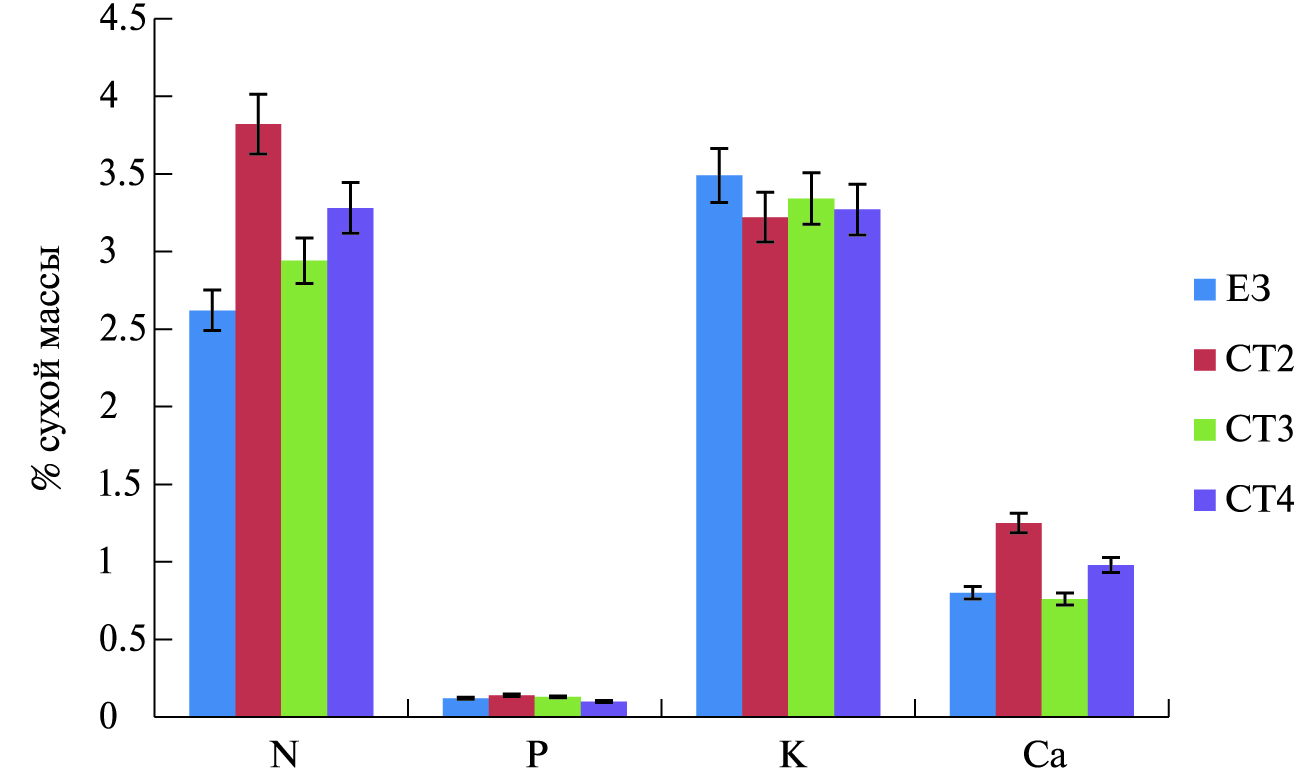 Результаты показали, что в сегетальной растительности (ЕЗ) было достаточно много N и K и незначительное количество Р и Са. Наибольшее количество элементов питания было обнаружено в смеси трав варианта СТ2, вероятно, благодаря присутствию большой доли люцерны, которая отличается высоким содержанием данных элементов [30]. Наибольшее накопление азота в смеси СТ2 по сравнению с ЕЗ и другими смесями определяло больший вынос его из почвы и значительное снижение содержания нитратного азота в почве при задернении этой смесью (табл. 2).