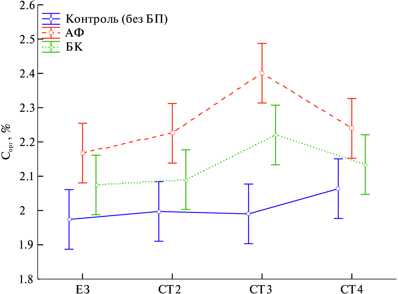 Влияние БП как фактора было несущественным (Fф < F05), создавалась лишь тенденция к увеличению Сакт под их действием на 44–50 мг/кг (6%) от контроля. При задернении существенное влияние на содержание Сакт оказали смеси СТ3 и СТ4, что превышало контроль на 7–9%. Из частных средних существенное и примерно равное увеличение Сакт вызвали сочетания АФ и БК с СТ4 – на 124 и 129 мг/кг или на 17% по сравнению с контролем при ЕЗ. Доля Сакт в составе Сорг составляла 3–4%. Отмечена лишь тенденция к увеличению его доли в варианте СТ4 на 0.2% по отношению к контролю при ЕЗ.