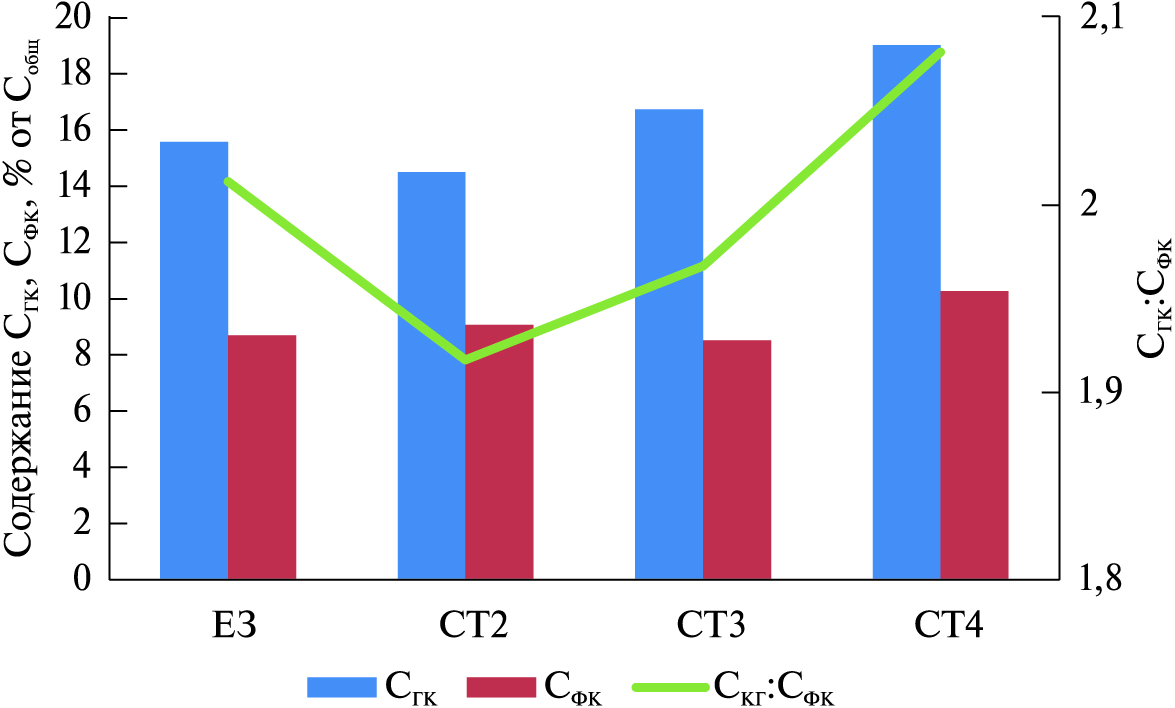 Кроме изменения содержания Сакт при биологизации, в почве менялся и состав гумуса. Содержание гуминовых кислот снижалось незначительно при задернении почвы в варианте СТ2 по сравнению с ЕЗ, в остальных вариантах увеличивалось, максимально в варианте СТ4. В то же время содержание фульвокислот увеличивалось при задернении в вариантах СТ2 и СТ4 в большей мере при воздействии последнего, что связано с образованием подвижных гумусовых кислот с увеличением поступления свежего органического вещества в почву и его гумификации. Это обусловило снижение соотношения СГК: СФК в почве в вариантах СТ2 и СТ3. Тип гумуса менялся с гуматного на фульватно-гуматный, что приводило к увеличению биологически доступного органического вещества для лучшего развития микробиоты [9]. В варианте СТ4, наоборот, этот показатель возрастал, что, вероятно, было связано с составом трав, изменением состава и численности микроорганизмов, выделяющих гумусоподобные вещества различной природы (рис. 4).