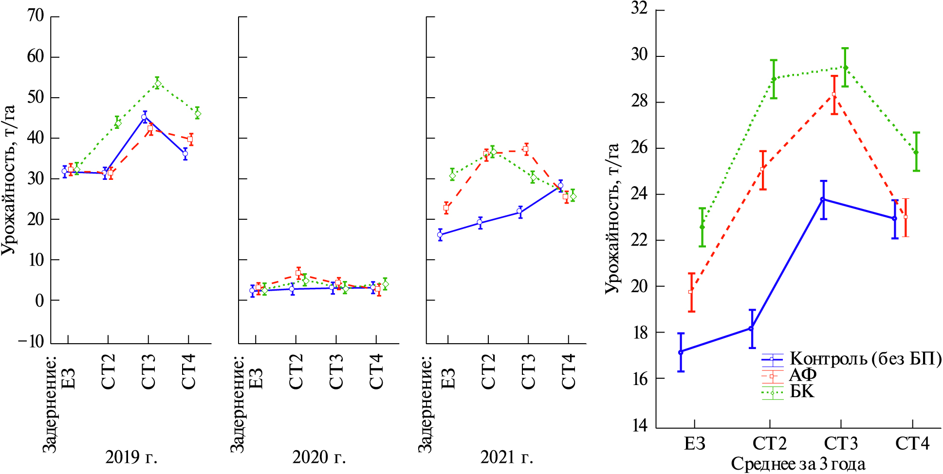 В среднем за 3 года опыта при задернении все варианты существенно увеличивали урожай на 4.1– 7.3 т/га, максимально – в варианте СТ3, что составило 37% от ЕЗ. При применении БП максимальную прибавку урожая обеспечивал БК – на 6.2 т/га, или на 30% от контроля. Из частных средних наибольший урожай получен в вариантах СТ2 и СТ3 + БК, на 12 т/га (на 70%) больше контроля при ЕЗ.