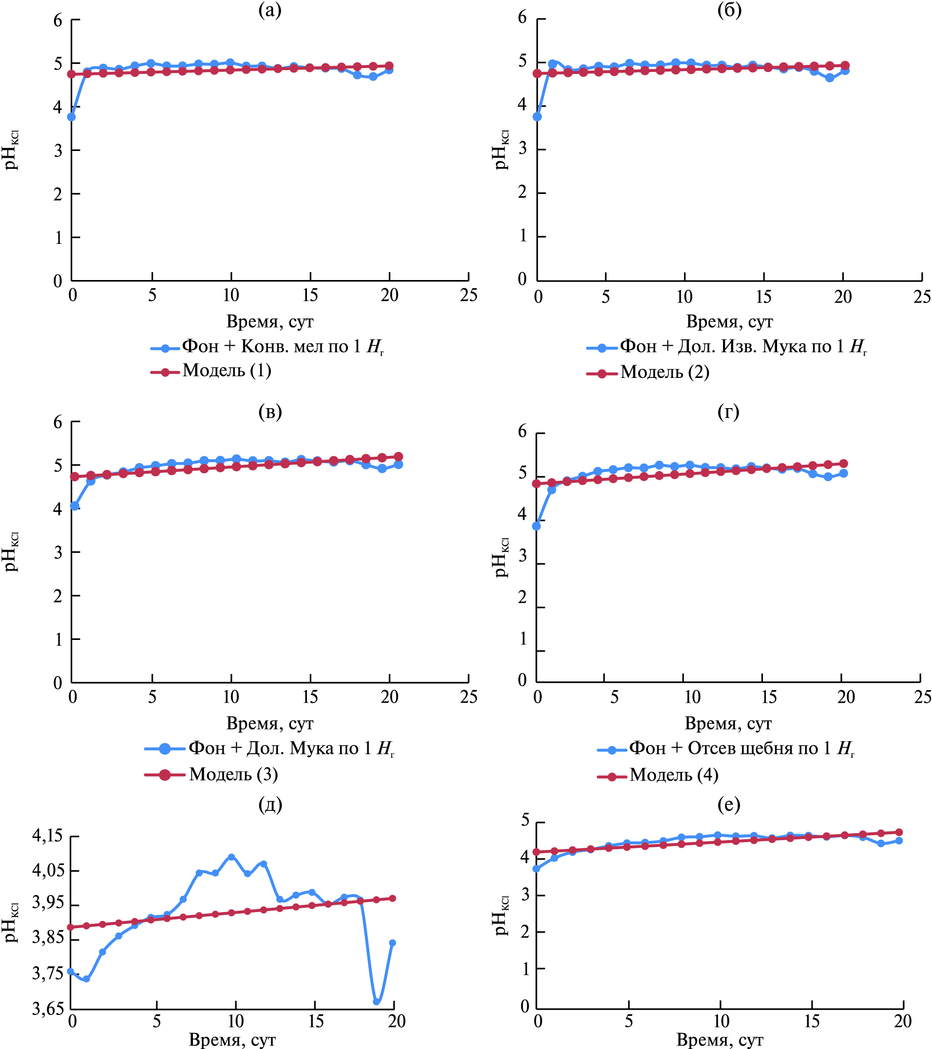 Аналогичный характер динамики изменения величины рН почвенной суспензии установлен в варианте с использованием для известкования тонкоизмельченного отсева доломита. Модели № 2, 3 и 4 изменения величины рН при использовании для известкования мелиорантов карбонатной природы на всем промежутке изучения были статистически не значимы (табл. 5). Графики моделей приведены на рис. 1б, в, г.