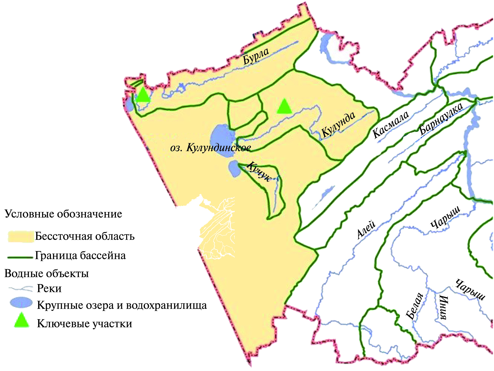 Почвенные исследования проводили на территории Кулундинской озерно-аллювиальной равнины в водосборных бассейнах рек Бурла (N3.336501°, E78.292122°) и Кулунда (N53.226948°, E80.645954°) Алтайского края, относящихся к внутреннему бессточному бассейну Обь-Иртышского междуречья, берущие начало на Приобском плато и теряющиеся в Кулундинской степи (рис. 2).