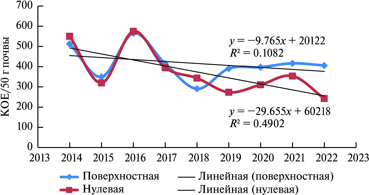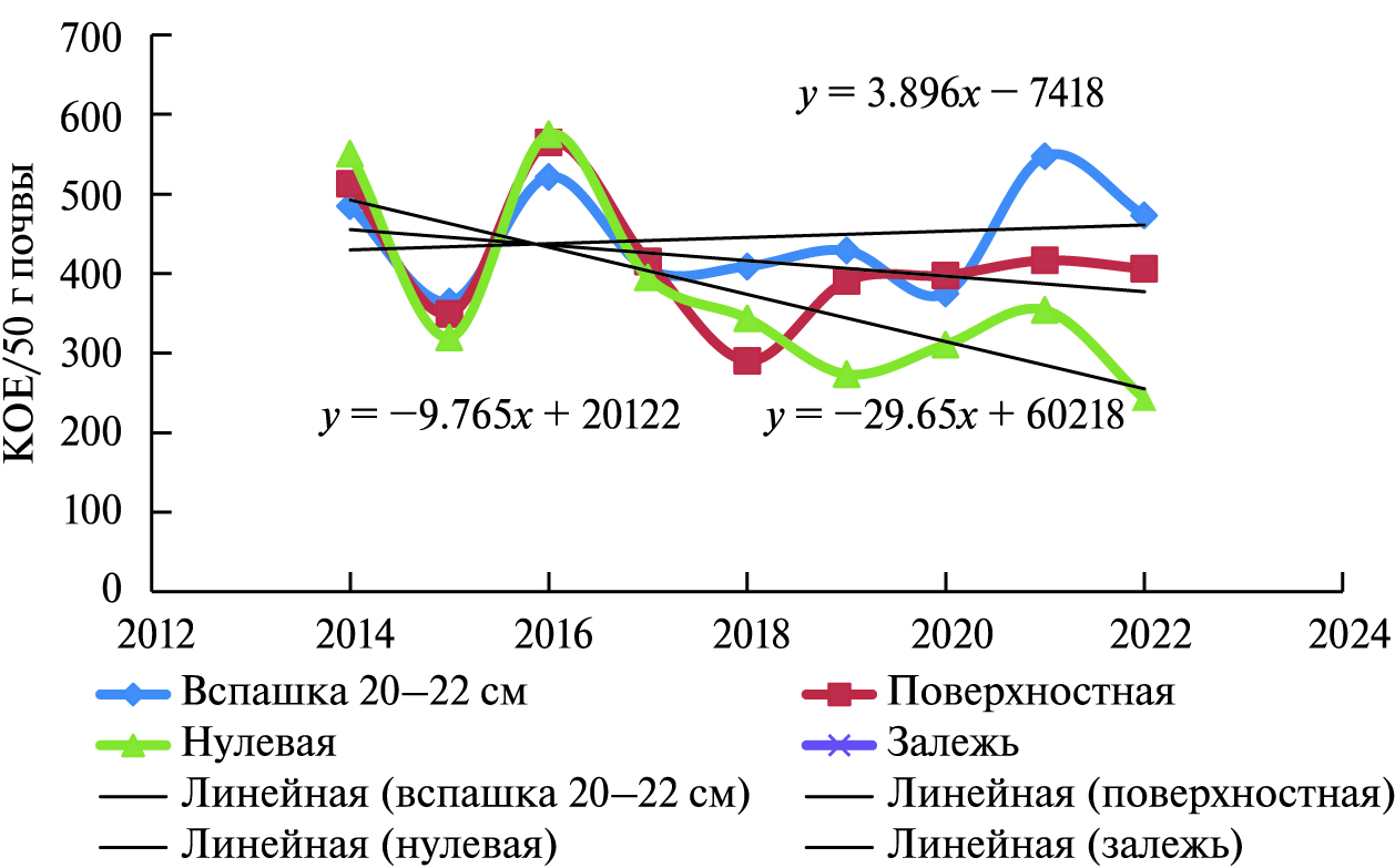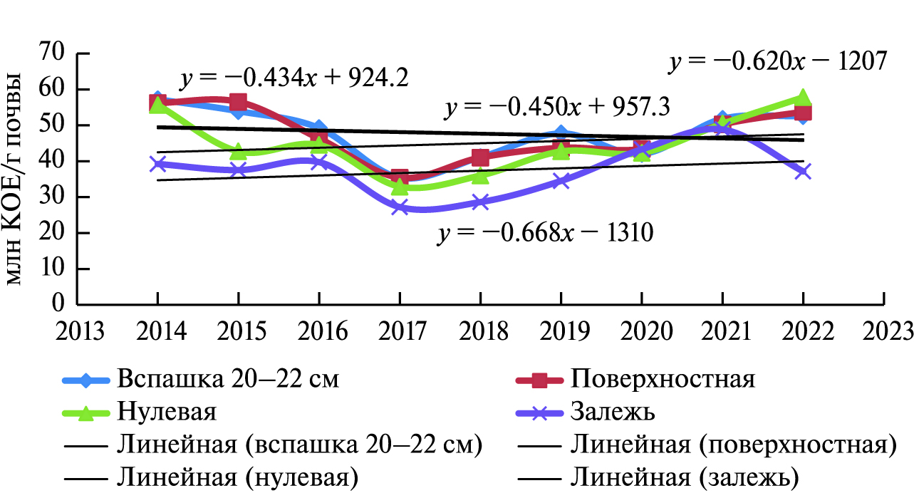 Показано, что на фоне выраженных амплитудных изменений общей численности микроорганизмов, обусловленных гидротермическими условиями вегетационных периодов при r = 0.46 при поверхностной обработке до r = 0.28 при нулевой обработке и r = 0.26 на залежи существовали трендовые закономерности изменения общей численности микроорганизмов в зависимости от изученных приемов обработки почвы. При максимальной среднегодовой биогенности (общей численности микроорганизмов) 0–20 см слоя почвы, равной 47.9 млн КОЕ/г почвы при вспашке на глубину 20–22 см поверхностная обработка на глубину 6–8 см приводила к некоторому снижению уровня биогенности до 47.4 млн КОЕ, а использование систематического прямого посева снижало среднегодовую общую численность микрооганизмов в этом слое до 45.0 млн КОЕ/г абсолютно сухой почвы или на 6.1%. При этом минимальная среднегодовая общая численность микроорганизмов была в залежи – 37.3 млн КОЕ/г абсолютно сухой почвы или на 22.1% меньше, чем при вспашке, и на 17.1% меньше, чем при нулевой обработке почвы. Необходимо отметить, что трендовая закономерность изменения биогенности (общей численности микроорганизмов) чернозема обыкновенного при нулевой обработке была аналогична таковой в почве, находящейся в условиях залежи, о чем свидетельствовали уравнения регрессии: y = 0.668x – 1310 в условиях залежи и y = 0.620x – 1207 при нулевой обработке только при более высоких показателях, что было связано с культурным агроценозом.