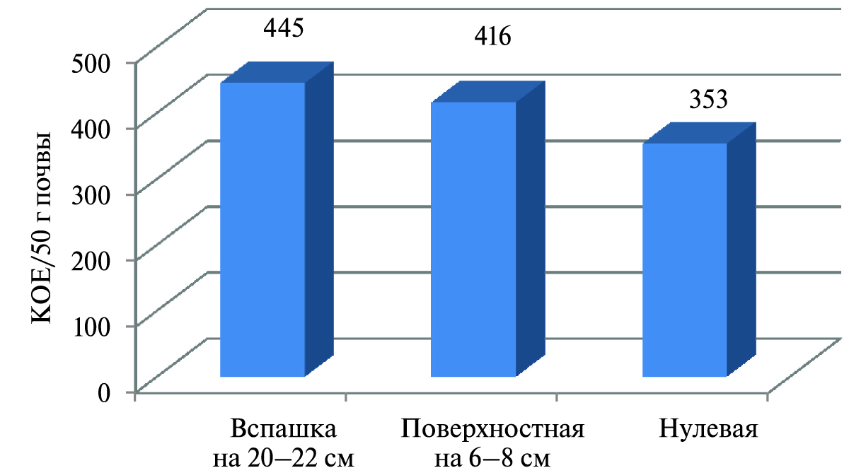 Результаты изучения динамики развития азотобактера и статистическая обработка данных свидетельствовали, что наиболее благоприятные условия для развития азотобактера складывались при вспашке, где отмечено наибольшее его присутствие со среднегодовой численностью 445 КОЕ/50 г почвы (рис. 2).
