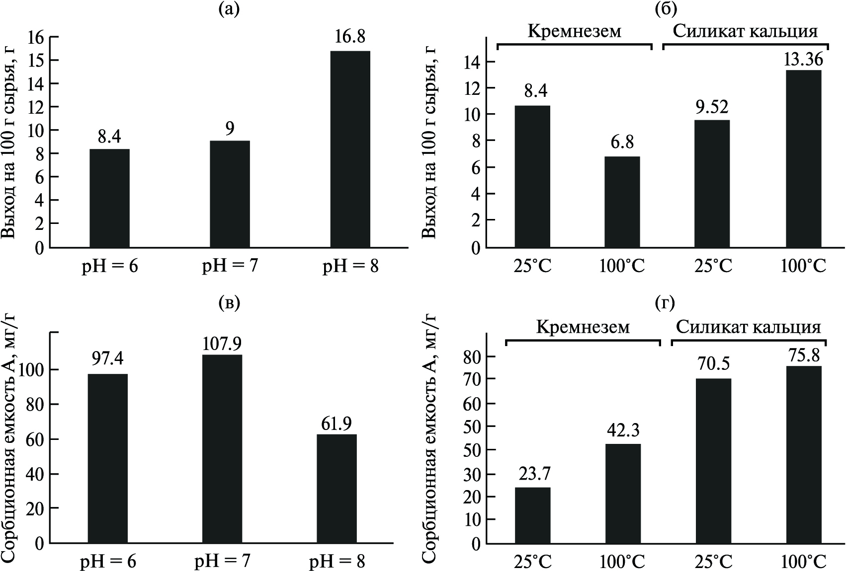 Условия синтеза. Зависимость свойств биогенных силикатов от условий синтеза была исследована по изменению сорбционной емкости и выхода продукта при варьировании кислотности и температуры среды. При увеличении рН выход силиката кальция увеличивался, а величины сорбционной емкости, наоборот, уменьшались (рис. 1а, б).