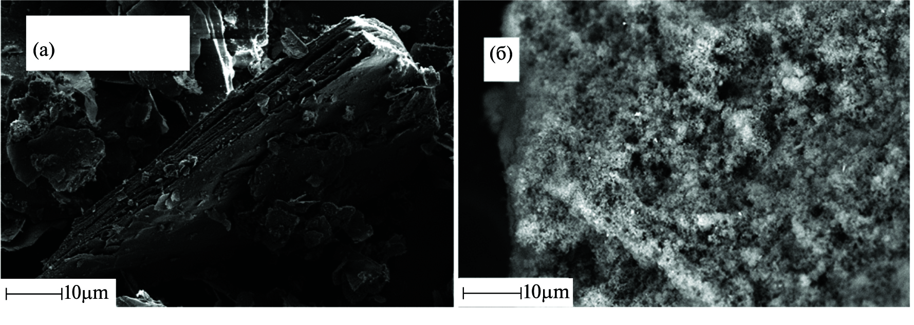 При помощи сканирующей электронной микроскопии была изучена морфология образцов. Образец минерального происхождения (образец 3) имел слоистую структуру с расстоянием между слоями не более 1 мкм, некоторые частицы расслаивались на более тонкие слои. Помимо этого, видны отдельные частицы пластинчатой формы, которые не образуют подобные слоистые структуры (рис. 3а). Образцы алюмосиликатов, полученных из растительного сырья, состояли из частиц неправильной формы размером до 60 мкм с развитой поверхностью и диаметром пор не более 1 мкм (рис. 3б).