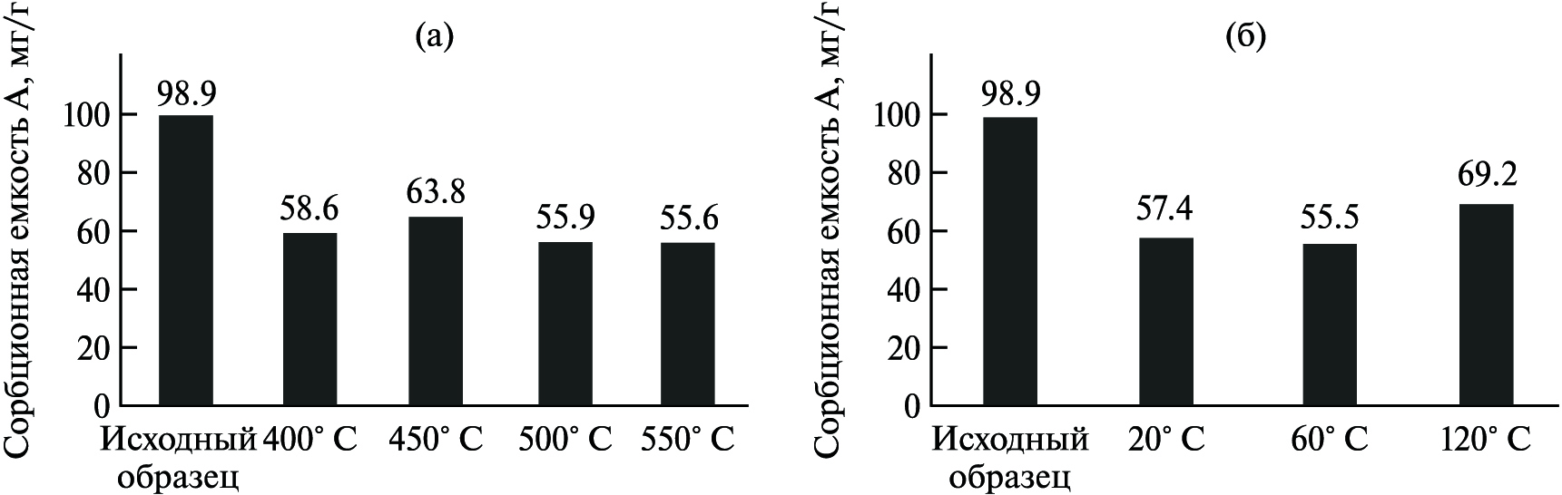 Видно, что сорбционная емкость прокаленного образца по отношению к МС после первого цикла возрастала, а затем снижалась и после 4-го цикла уменьшалась в 1.8 раза. После первого цикла поверхность становилась более активной за счет неполного выгорания МС, а затем на ней снижалось количество активных центров в результате многократного воздействия температуры. Таким образом, практически возможна термическая регенерация полученных сорбционных материалов с сохранением 82% первоначальной сорбционной емкости на протяжении 3-х циклов.