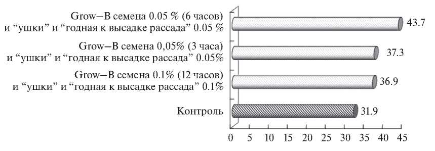 Вариант опыта с замачиванием семян в течение 6 ч и двукратной обработкой рассады 0.05%-ным раствором биостимулятора роста Grow–B показал наилучшие результаты.