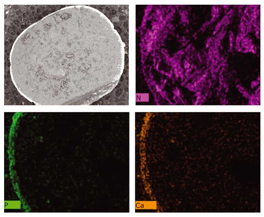Рис. 1. Микрофотография скола гранулы капсулированного карбамида и распределение азота, фосфора и кальция по поверхности скола.