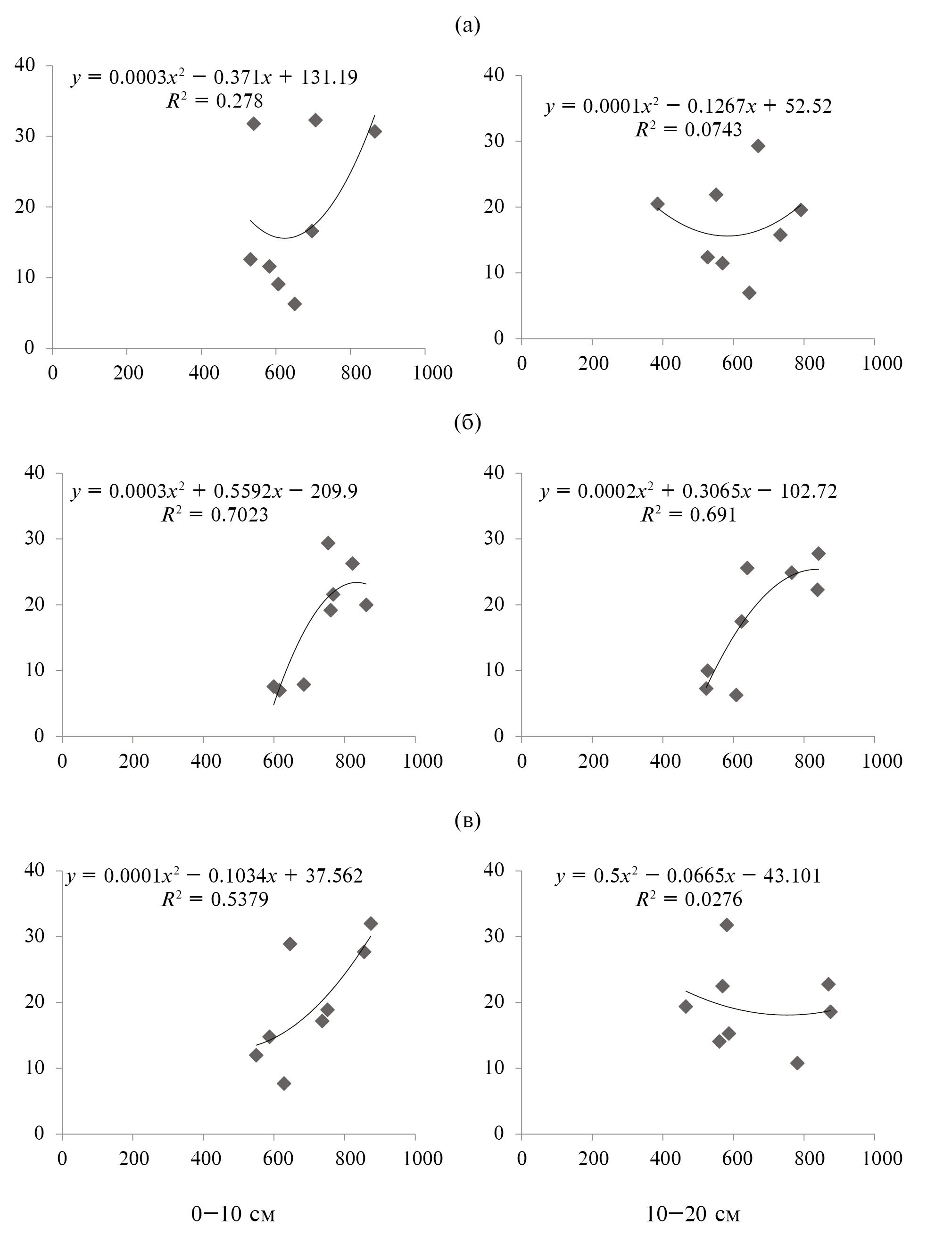 Отсюда очевидны выявленные более сильные корреляционные связи содержания С0.1 NaOH с показателями соотношения углерода и азота в почве. Эти зависимости указали, что с расширением соотношения происходило увеличение содержания подвижных органических соединений. Причем выявленные закономерности проявлялись на минимальных фонах в обоих исследованных слоях почвы. Обнаруженное свидетельствовало о диагностической информативности показателя С: N в формировании метаболически активного фонда азота и возможности его использования в прогнозных целях. По мнению авторов [20], динамика минерализации–иммобилизации азота в почве зависит не столько от общего содержания углерода и азота в разлагаемом материале, сколько от его способности к минерализации органических субстратов, а также от условий, контролирующих реминерализацию иммобилизованного ранее азота.