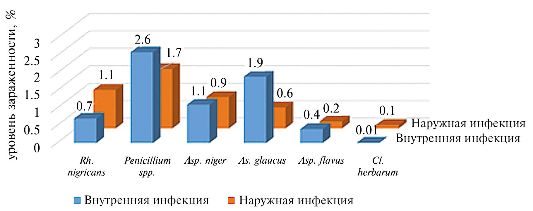 Показано, что наибольший уровень наружной инфекции приходился на группу видов Penicillium, A. glaucus и A. niger, наибольший уровень внутренней инфекции – на группу Penicillium, Rhizopus nigricans и A. niger (рис. 2).