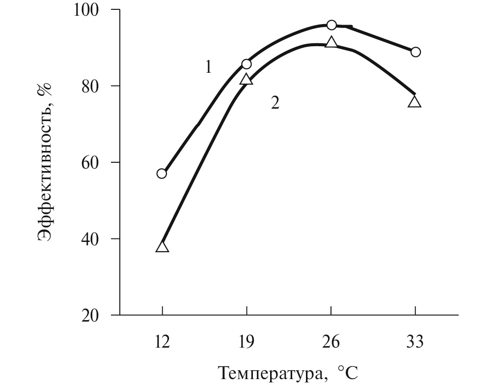 Метеозависимость действия гербицидов группы бетанала на растения заметно проявлялась в полевых условиях. При низких температурах воздуха замедлялись процессы роста и развития растений, снижалась активность гербицидов. При температурах <15°С увеличивался период летального действия гербицидов, особенно дженериковых препаратов, на сорняки из-за снижения активности обменных процессов в растениях. С повышением температуры до 25°С возрастала скорость поглощения гербицидов в растения и тем самым увеличивалась их эффективность на сорняки. При температуре >25°С уменьшалась миграционная способность гербицидов группы бетанала, появлялась опасность усиления их токсичности и контактного действия на растения, в результате чего эффективность гербицидов группы бетанала снижалась. Подобная зависимость эффективности действия гербицидов на сорную растительность от температуры воздуха характерна для всех исследованных препаратов бетанальной группы с той разницей, что активность дженериковых препаратов на сорняки была существенно меньше в сравнении с активностью оригинального гербицида БЭОФ в условиях критических температур для роста и развития растений (рис. 2).