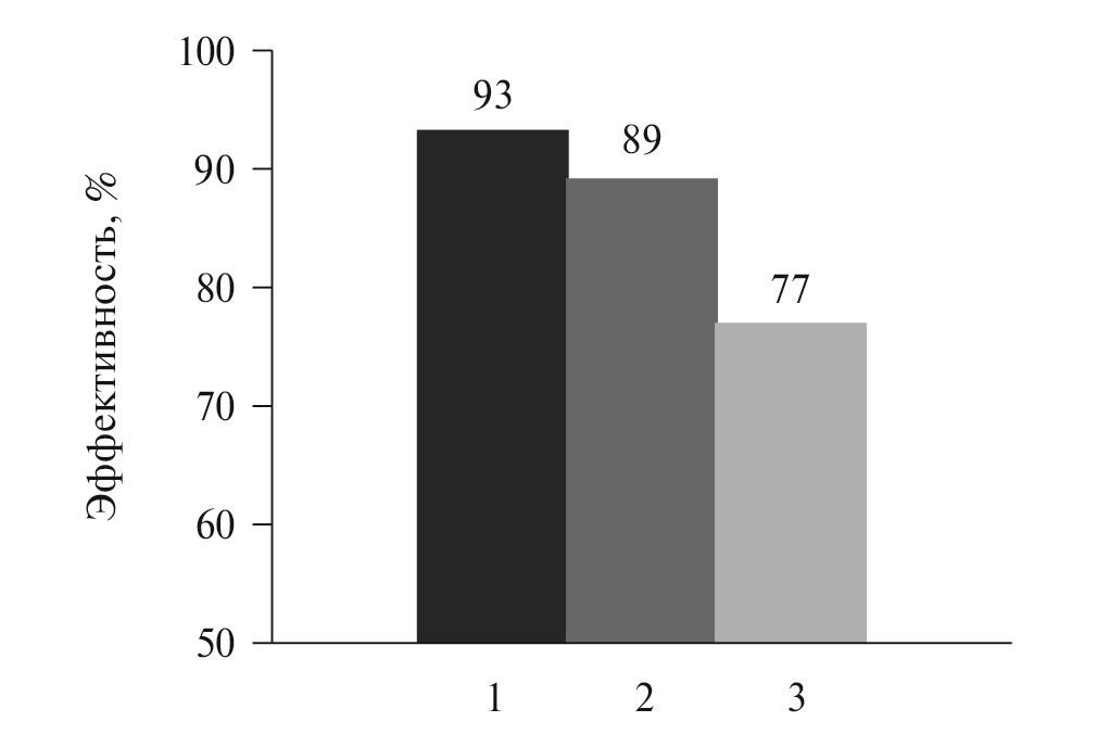 Рис. 4. Эффективность действия кристаллических растворов дженериковых бетаналов на сорняки в зависимости от величины кристаллов в растворе: 1 – раствор применен сразу после приготовления, 2 – раствор применен через 6–7 ч после приготовления (кристаллы размером 10–15 мкм), 3 – раствор применен через 12–16 ч после приготовления (кристаллы размером 40–80 мкм).