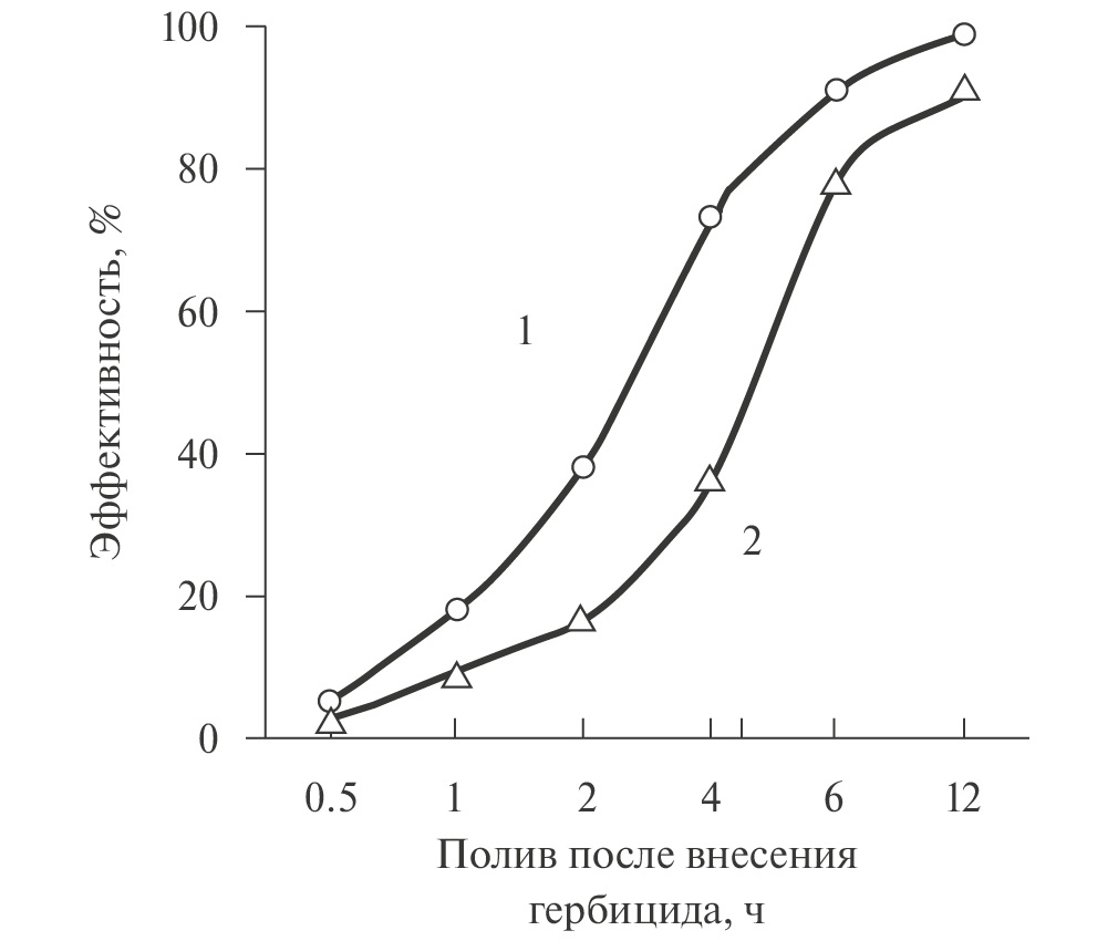 При дождевании сорных растений через 4 ч после внесения гербицидов различия в эффективности между оригиналом и дженериками в среднем составили 40%. Относительное выравнивание показателей эффективности действия на сорняки гербицидов-дженериков с оригиналом отмечали при дождевании растений через 6 и особенно 12 ч после обработки гербицидами.
