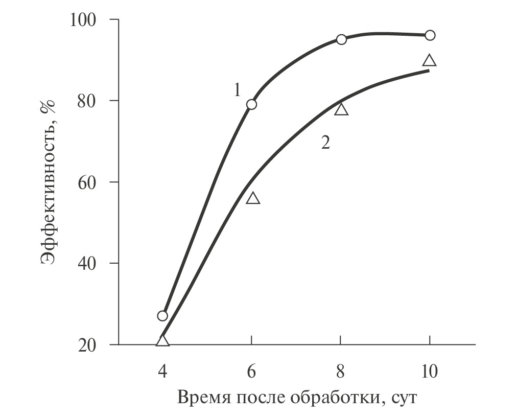 Физико-химические особенности препарата оказывали большое влияние на хозяйственные показатели – эффективность и качество примененного гербицида при разных условиях погоды. Благодаря формуляции БЭОФ, где использовано сочетание специфических производных растительного масла с другими компонентами, обеспечивалось создание пленки, которая дольше удерживалась на поверхности листьев и поддерживала наиболее высокий уровень контроля над сорняками. При выпадении осадков или обильной росы гербициды бетаналы-дженерики легче смывались с листьев растений, поэтому для этих препаратов требовалось больше времени с момента внесения гербицида до ожидаемых осадков. Методом искусственного дождевания делянок в течение 3-х мин через разное время после внесения гербицидов оценивали способность к смыву тонкой пленки препаратов в норме расхода 1.0 л/га с поверхности листьев сорняков. Эффективность гербицидов определяли через 8 сут после обработки. Контролем служили обработанные растения сорняков без применения дождевания. Показатели эффективности гербицидов в контроле были близки к показателям применения гербицидов при дождевании через 6–12 ч после внесения препаратов.
