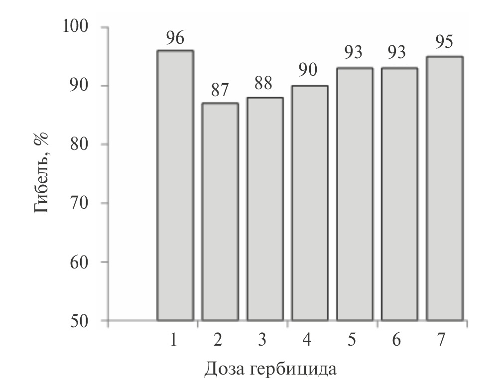 Гербициды группы бетаналов очень чувствительны к рН воды [7, 12]. Щелочная реакция воды заметно снижала эффективность действия гербицидов группы бетаналов на сорняки (рис. 6).