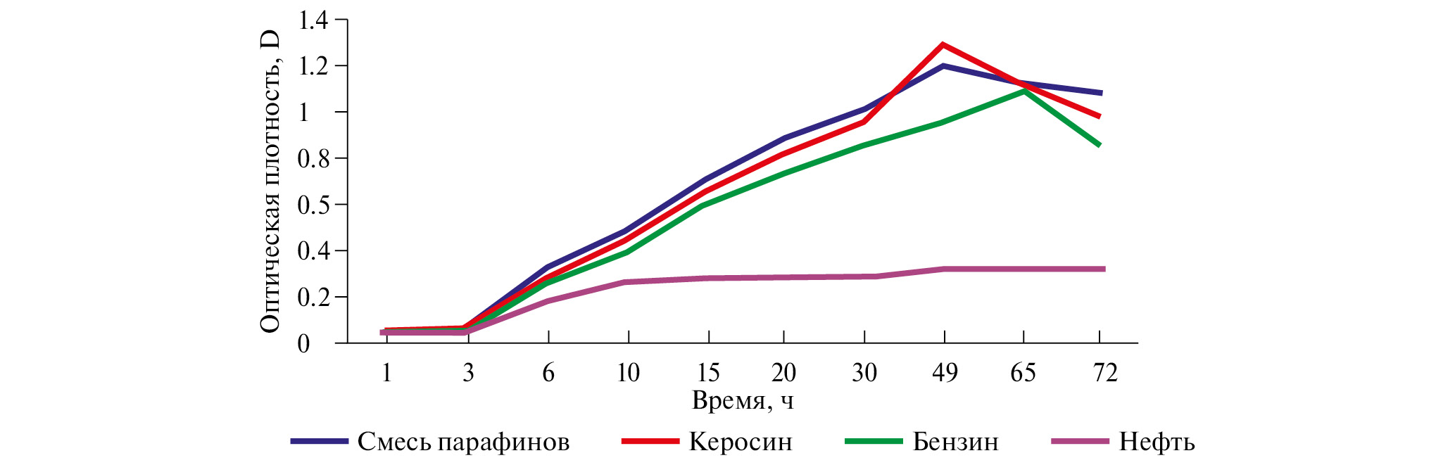 На рис. 2 показана способность одного из активных штаммов – Pseudomonas sp.11 на жидкой среде Раймонда при непрерывном культивировании потреблять парафиновые углеводороды, сырую нефть и нефтепродукты.