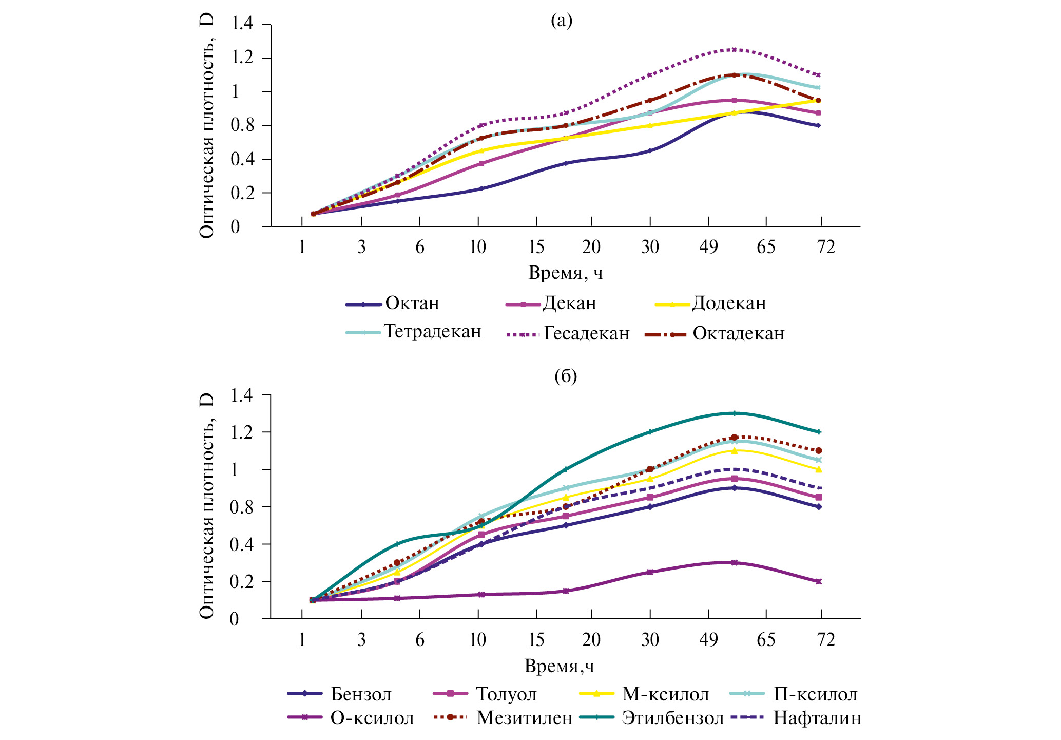Показано (рис. 3б), что все испытанные индивидуальные ароматические углеводороды потреблялись активной культурой, за исключением о-ксилола, т. е. интенсивность использования углеводородов зависела от структуры ароматического субстрата. Однозамещенные бензольного ядра – бензол и толуол использовались слабее, чем двухзамещенные бензола – мета- и пара-ксилолы, мезитилен, этилбензол.
