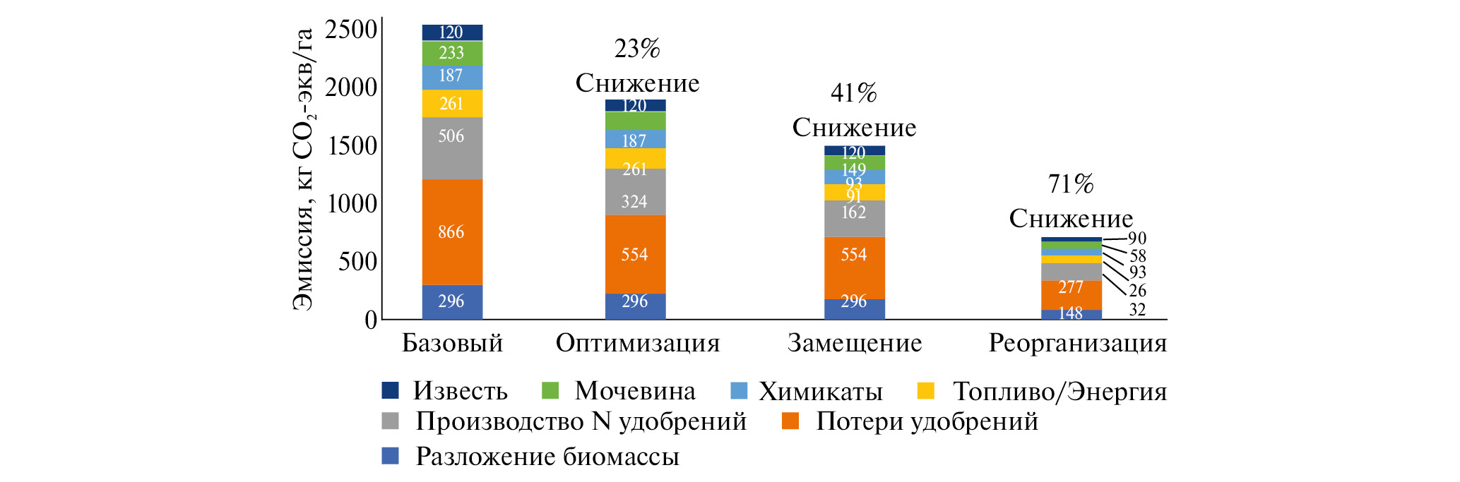 Взвешенный коэффициент выбросов может составлять 2.2 т CO2-экв/т удобрений при добыче и транспортировке ископаемого топлива, используемого в промышленности по производству минеральных удобрений (включая 1.8 т CO2-экв/т N–1 от добычи энергии, используемой для синтеза аммиака, и 0.4 т CO2-экв/т N–1 при его использовании для производства, например, N-Р-удобрений). Для условий Китая это составляет 16% от общего объема выбросов 13.5 т CO2-экв/т N–1 [60]. С учетом различных источников сырья эти величины могут широко варьировать: <1–>12 т CO2-экв/т произведенных и использованных удобрений.