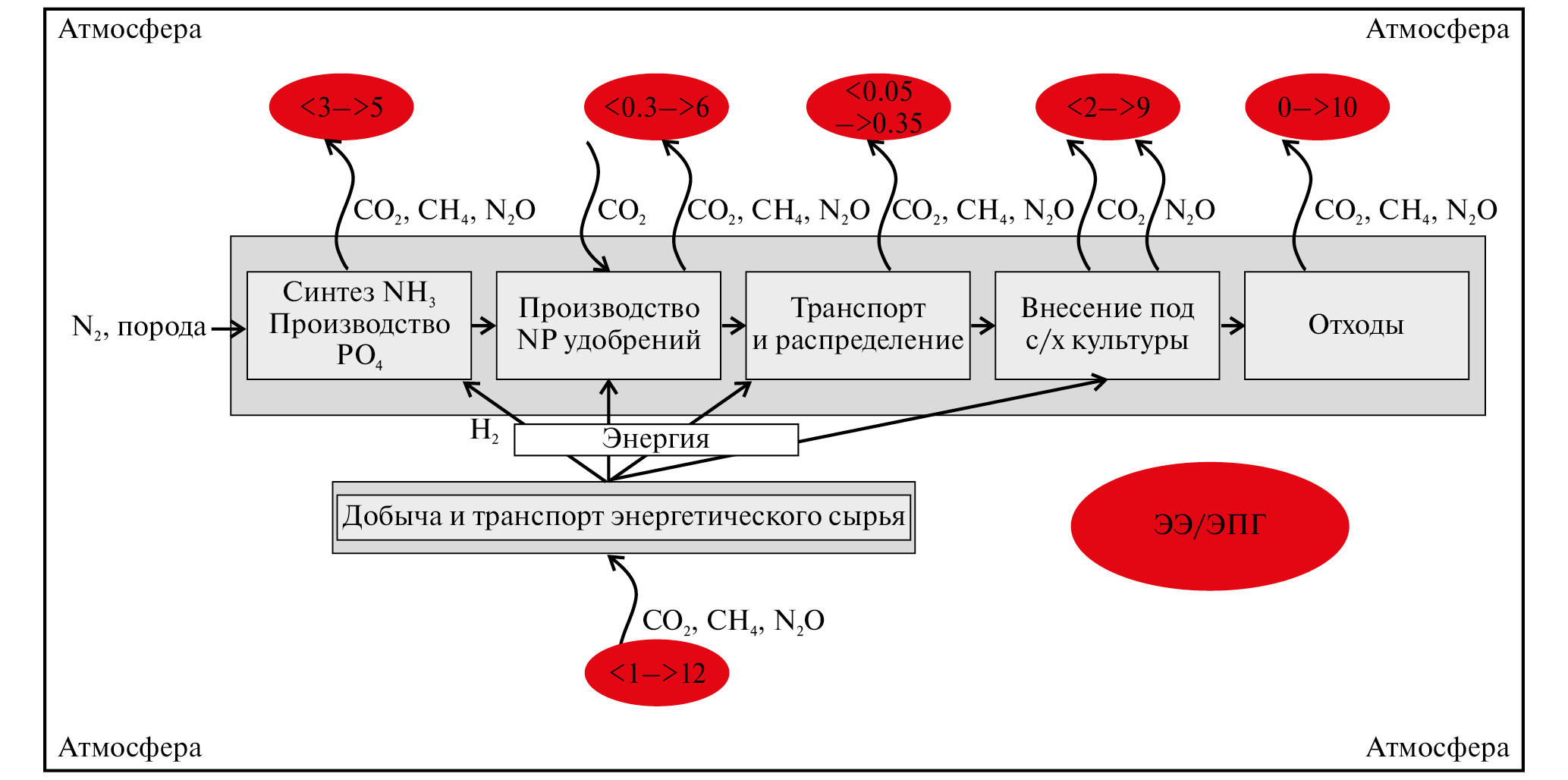 Цель работы – анализ сопряженных процессов потребления энергии и выбросов парниковых газов в системе “производство минеральных удобрений – транспортировка – внесение в агроэкосистемах – утилизация агроотходов” и оценка факторов энергоэффективности. При этом размеры выбросов ПГ на всех этапах жизненного цикла можно рассматривать как меру энергоэффективности.
