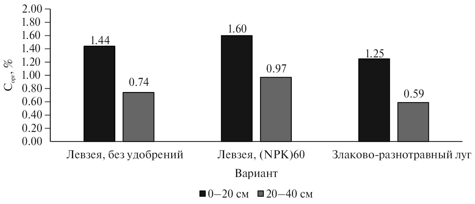 Содержание органического углерода в почве под левзеей сафлоровидной 14-го года жизни определяли величина ежегодного поступления большого количества растительных остатков и скорость их гумификации, которые зависели от качественного состава и гидротермических условий. В слое 0–20 см почвы содержание углерода повысилось относительно исходного уровня на 3.6% в варианте без удобрений и на 15.1% в варианте N60P60K60, в слое 20–40 см – на 8.8–42.6% соответственно. В почве под многолетней кормовой культурой наблюдали депонирование углерода в виде гумусовых веществ за счет его запасания в более глубоких слоях почвы.
