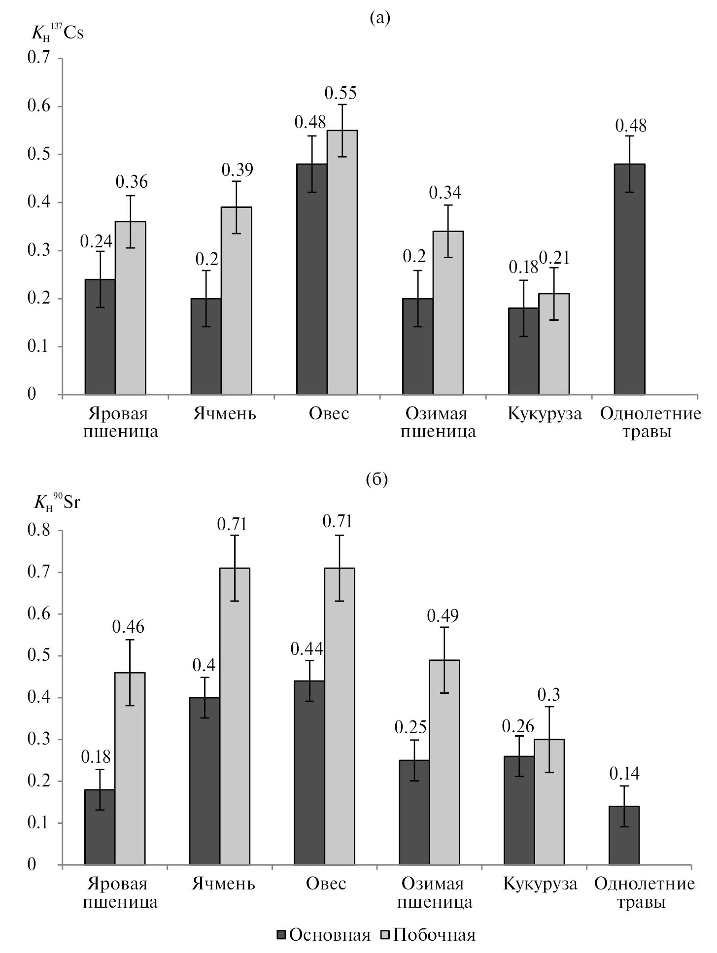 Интенсивность перехода 137Cs из почв, как в основную, так и побочную продукцию культур совпадала с рядом увеличения удельной активности. Интенсивность перехода 90Sr в продукцию культур не совпадала с рядом содержания 90Sr в продукции культур. Величины КП90Sr для основной продукции возрастали в ряду: яровая пшеница > озимая пшеница > кукуруза > ячмень > овес; КП90Sr для побочной продукции: кукуруза > яровая пшеница > озимая пшеница > ячмень > овес.
