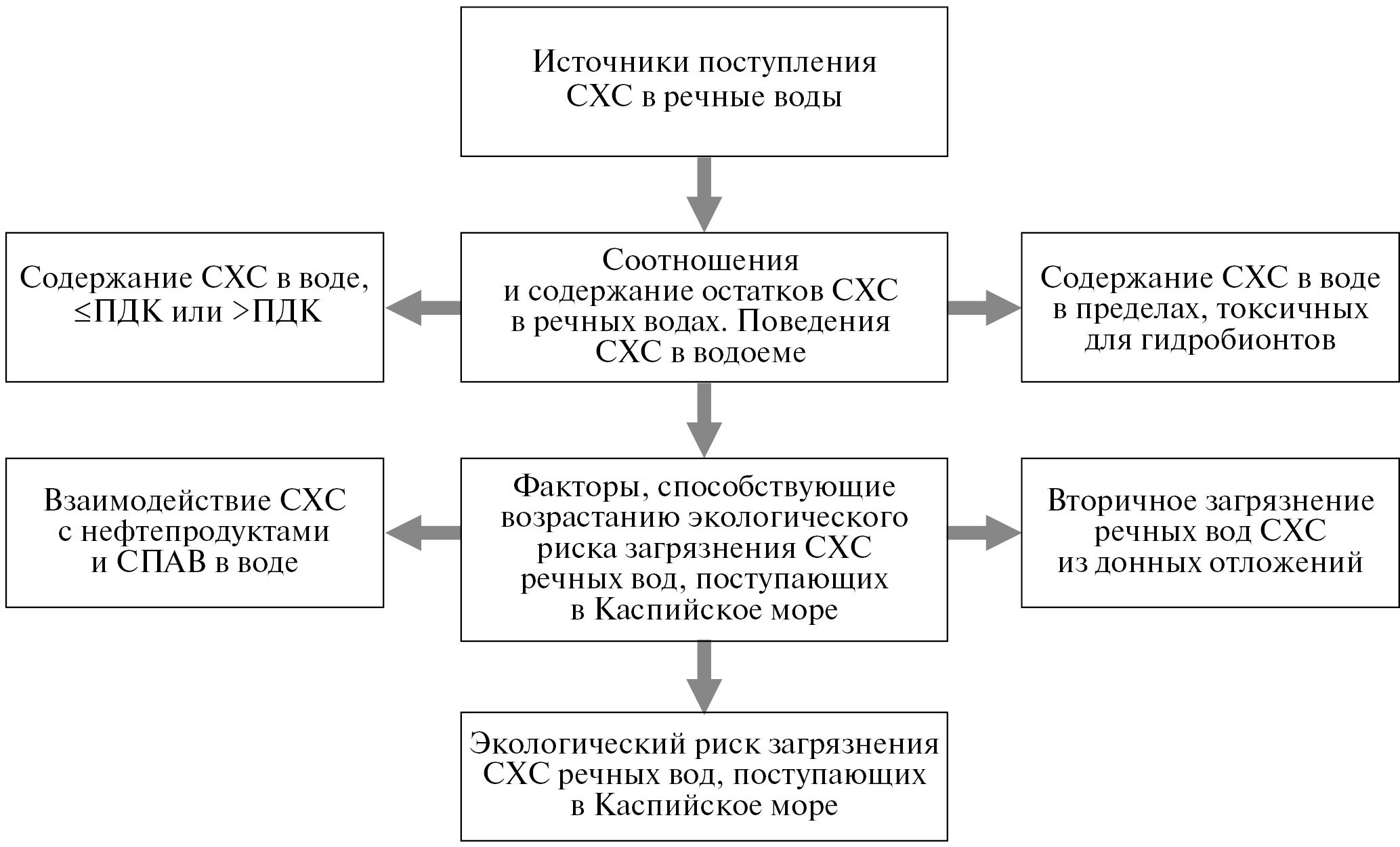 Рис. 1. Концептуальная модель экологического риска загрязнения речных вод, поступающих в Каспийское море, стойкими хлорорганическими соединениями (СХС); СПАВ – синтетические поверхностно-активные вещества.