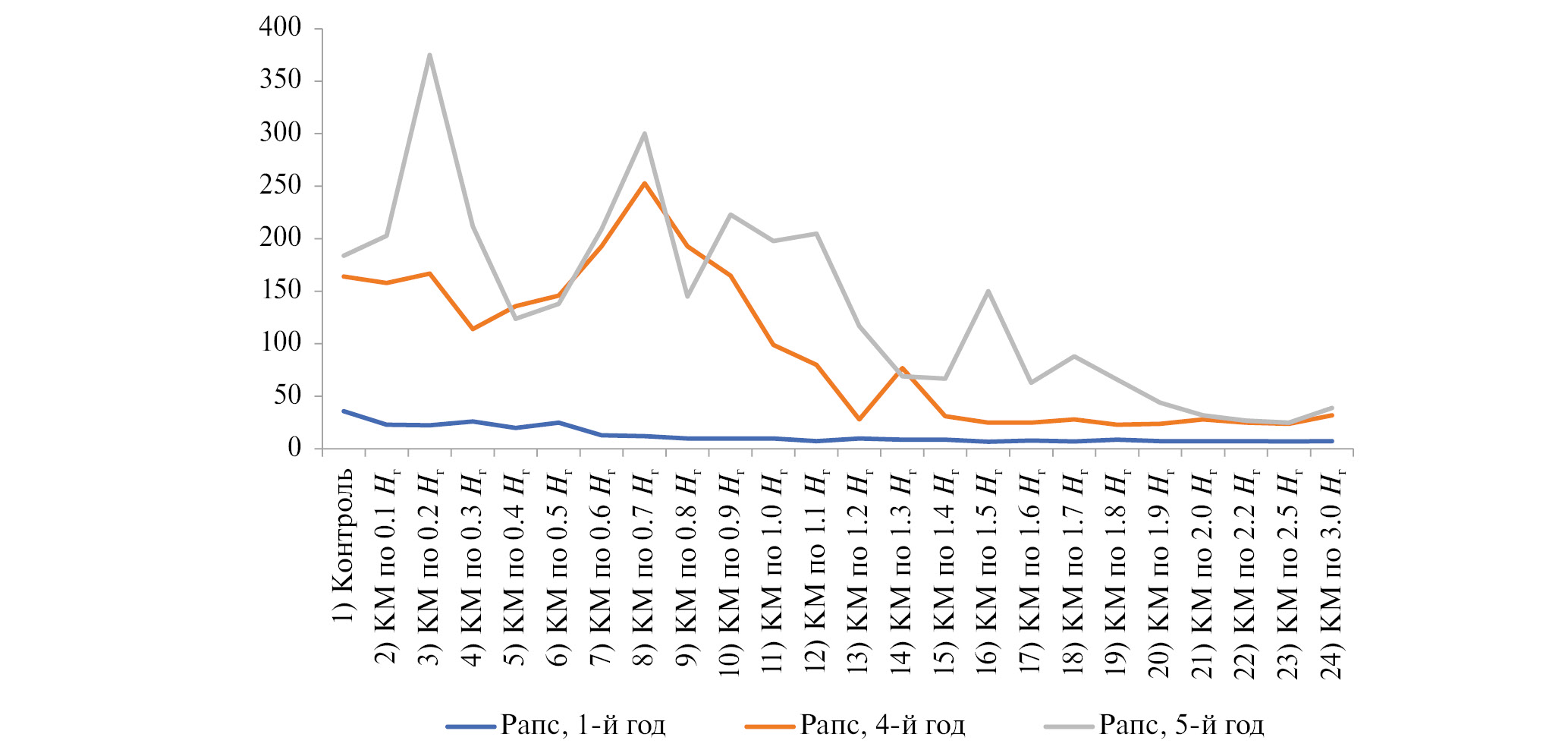 Вариант | Доза КМ, т/га | 1-й год (Рапс)* | 2-й год (Вика) | 3-й год (Ячмень) | 4-й год (Рапс) | 5-й год (Рапс) | ||||