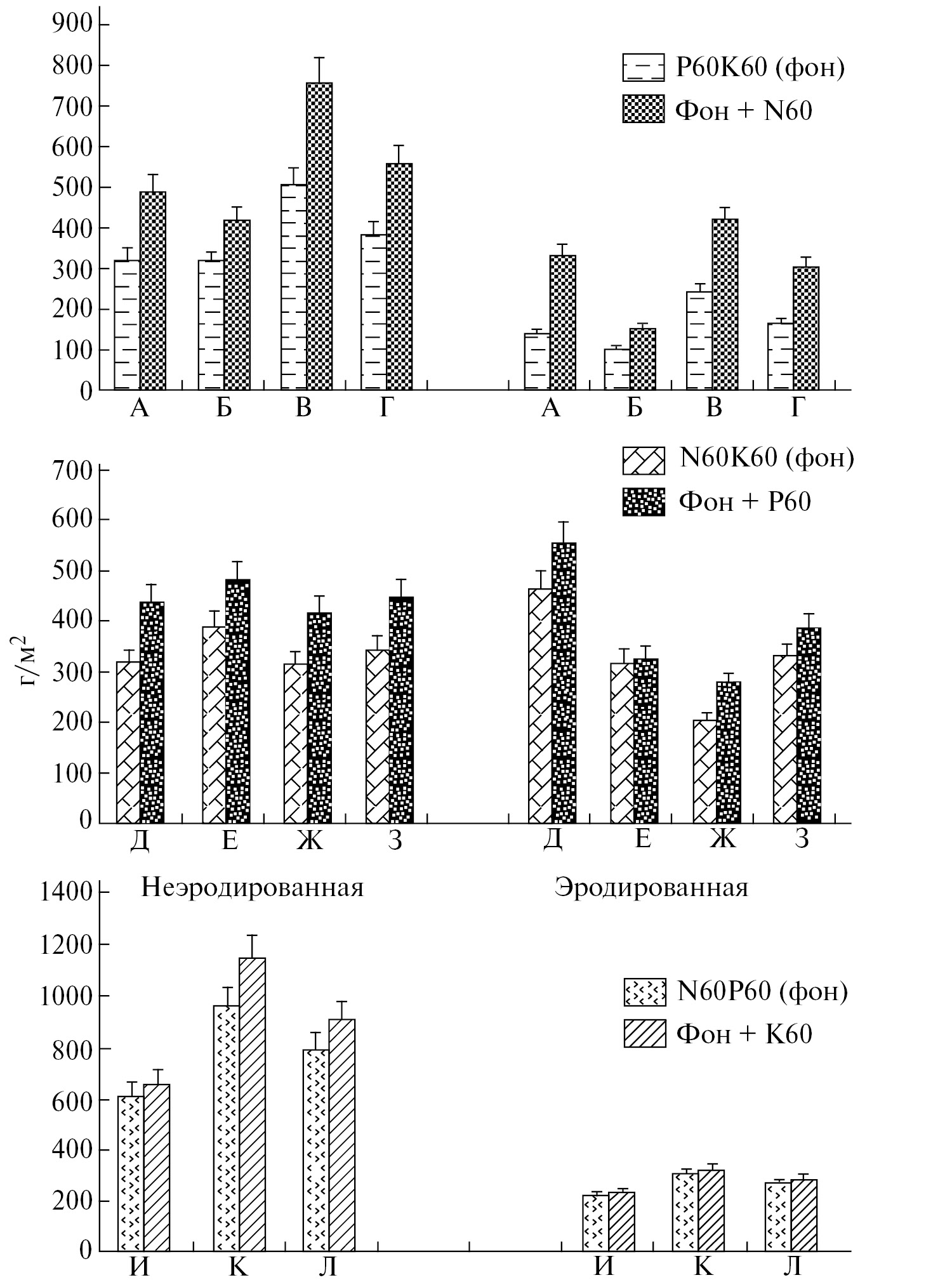 Эффективность внесения фосфорных удобрений под луговые травы на неэродированной лугово-черноземной почве существенно уступала азотным; в среднем за 2009–2011 гг. прибавка составила 30% при урожае на фоне N60K60 338 г/м2. Больших отличий в продуктивности растений по годам не отмечали, она менялась в варианте с азотно-калийным удобрением в пределах 310–385 г/м2. На эродированной лугово-черноземной почве по сравнению с неэродированной растения лучше отзывались на внесение фосфорных удобрений: в среднем за 3 года урожай луговых трав в азотно-калийном варианте достигал 320 г/м2. Прибавка от внесения фосфора оказалась небольшой, всего 17%.