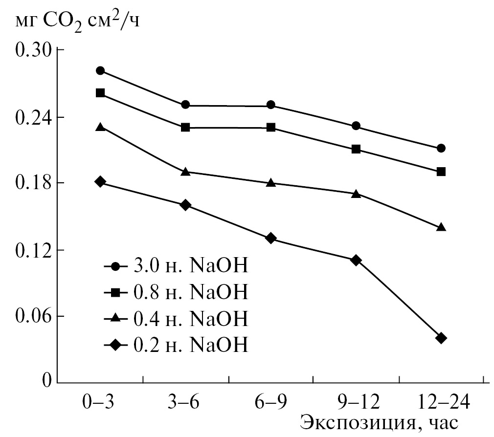 Видно, что это замедление наблюдается на всем протяжении суточного периода и более выражено при меньших концентрациях раствора щелочи. Например, по отношению к экспозиции 0–3 ч скорость поглощения СО2 0.8 н. NaOH в период 12–24 ч составила только 73, 0.4 н. NaOH – 61%. Следовательно, для измерения фактической эмиссии СО2 в широком диапазоне биологической активности почвы диаметр сосуда-изолятора и экспозиция, определяющие количество диффундирующего СО2, должны определенным образом соответствовать параметрам поглотителя – поверхности, концентрации и объему раствора щелочи.