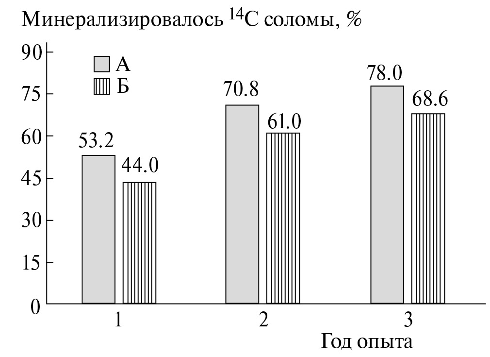 Рис. 3. Сравнительное определение степени минерализации меченной14С пшеничной соломы в парующейся (А) и занятой растениями (Б) почве [76].