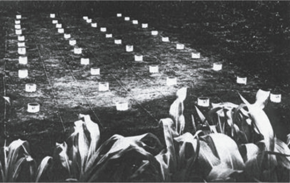 О складывающемся в почве балансе углерода удобно судить на основании определения на парующейся площадке дозы растительного вещества (органического удобрения), обеспечивающей поддержание в почве бездефицитного баланса элемента [76]. Эта доза сравнивается с фактическим количеством органического вещества, которое поступает в почву в условиях агроценоза, и делается вывод о складывающемся в ней балансе углерода. Коротко процедура определения дозы удобрения сводится к следующему. Весной, сразу после достижения парующейся почвой физической спелости, на микроделянках размером 30 × 30 (см) в почву вносят возрастающие дозы измельченного органического удобрения (растительного материала), например, из расчета 3.0, 6.0 и 9.0 т воздушно-сухого вещества/га. В центр каждой микроделянки, в том числе без внесения материала, врезают сосуд-изолятор (рис. 4) и путем определения 1 раз в неделю среднесуточной скорости продуцирования СО2 почвой рассчитывают суммарную за теплый период (май–октябрь) эмиссию СО2 из почвы.