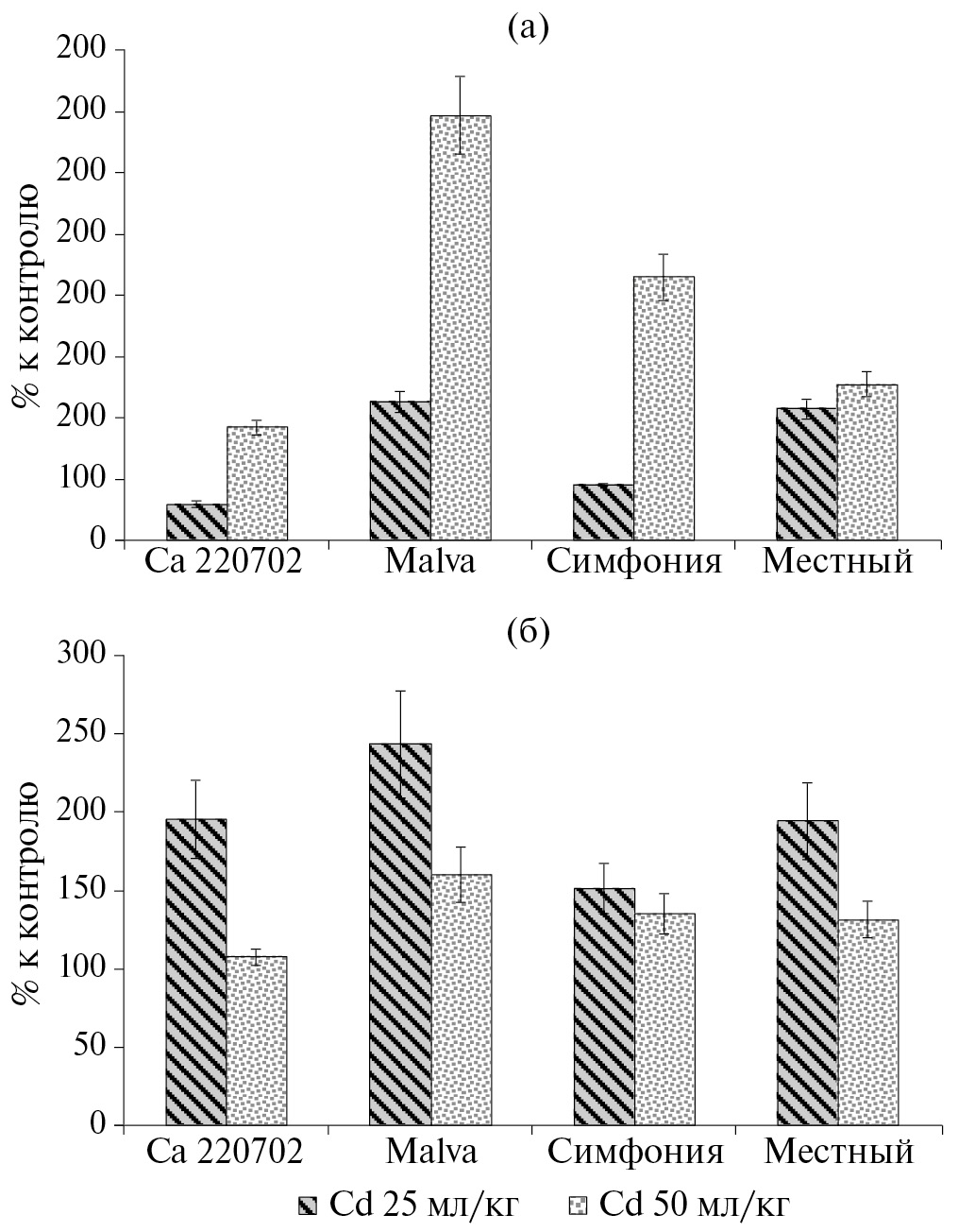 В то же время при концентрации кадмия 50 мг/кг наблюдали заметное угнетение развития как чувствительных, так и устойчивых сортов. Однако это утверждение справедливо не для всех сортов и не для всех показателей (рис. 2б). При этом внутривидовые особенности ответа растений на токсический стресс четко отследить не удалось. Например, высота растений всех 4-х сортов менялась на уровне, близком к контрольному, или оказывалась, несущественно меньше такового (до 92% у устойчивого сорта Местный). Сорт Симфония, правда, немного опережал остальные по этому показателю, но на незначительную величину (102% от контроля). Внутривидовые показатели площади листьев различались существенно, однако их не удалось связать с выявленной ранее устойчивостью к кадмию. Например, значимое угнетение демонстрировали как устойчивый сорт Местный (45% от контроля), так и чувствительный Malva (44%). В то же время у устойчивого сорта Симфония и чувствительного Са 220702 также наблюдали угнетение этого показателяя (78 и 77% соответственно), но гораздо меньшее, чем у 2-х других сортов. Что касается биомассы, то она сокращалась при действии кадмия у всех сортов, кроме сорта Симфония, у которой, напротив, даже отмечена стимуляция (112% от контроля).