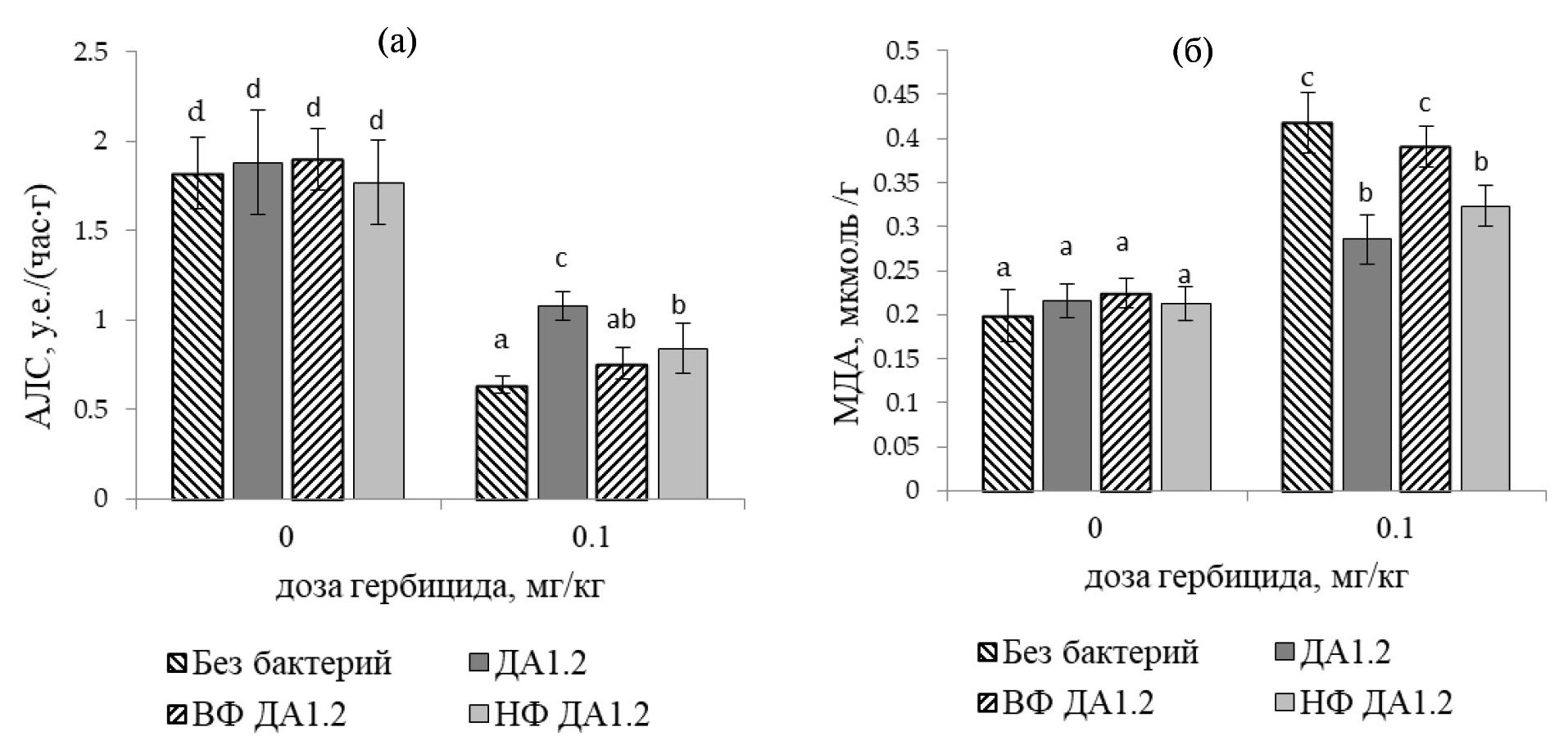 Таким образом, обработка культурой бактерий P. protegens DA1.2 и ее производными в лабораторном вегетационном эксперименте уменьшала фитотоксичность загрязненной метсульфурон-метилом почвы для растений рапса. Защитный эффект обработок убывал в ряду: культуральная жидкость (КЖ) с живыми клетками бактерий–бесклеточная низкомолекулярная фракция КЖ–бесклеточная высокомолекулярная фракция КЖ. На биохимическом уровне он выражался в частичном восстановлении нормальной активности фермента ацетолактатсинтазы (AЛС), уменьшении окислительных повреждений и изменении активности антиоксидантных ферментов.