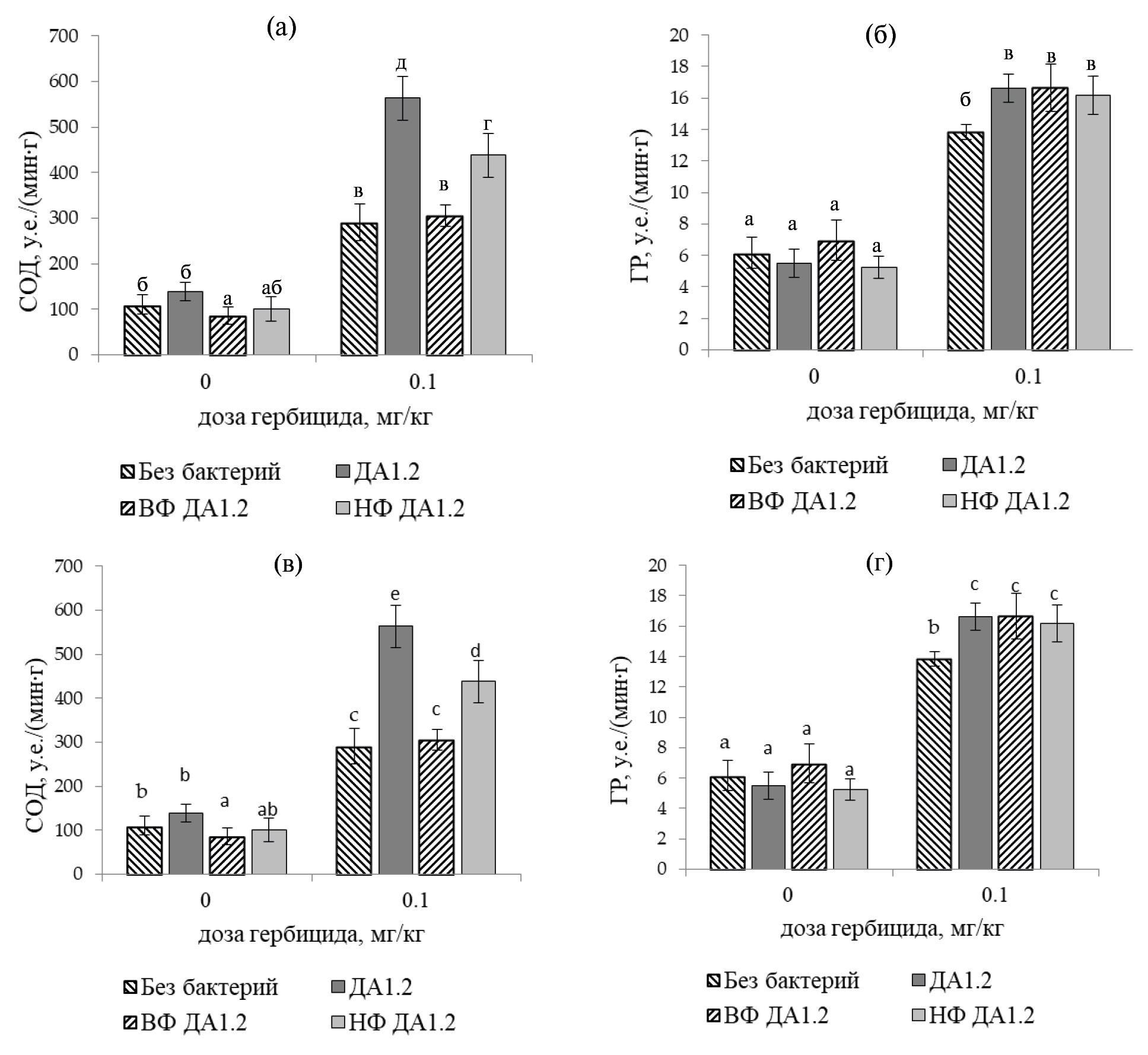 Исследователи активно ищут новые возможности практического применения полезных для растений микроорганизмов [6]. Это связано с растущей обеспокоенностью потребителей сельскохозяйственной продукции токсическим воздействием пестицидов, а также большим потенциалом бактерий для решения различных задач агрономии. Использование бактерий в качестве антидотов гербицидов было продемонстрировано относительно недавно [7–9]. В описанных экспериментах зафиксировано улучшение роста сельскохозяйственных растений, но мало внимания уделено биохимическим процессам, опосредующим защитное действие бактерий.