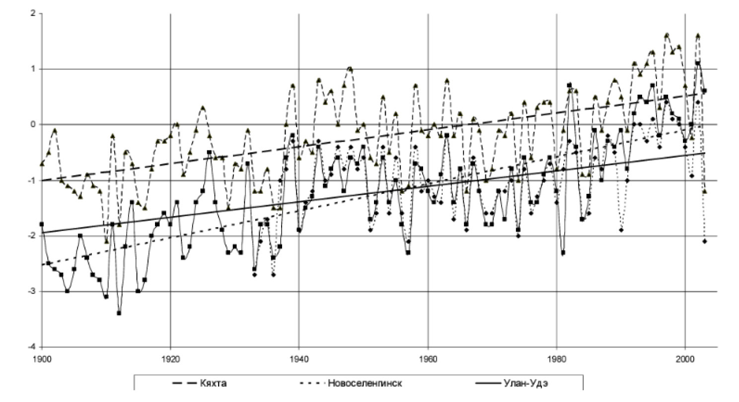 Рис. 1. Многолетняя динамика и тренды средней годовой температуры воздуха в Байкальском регионе [23].