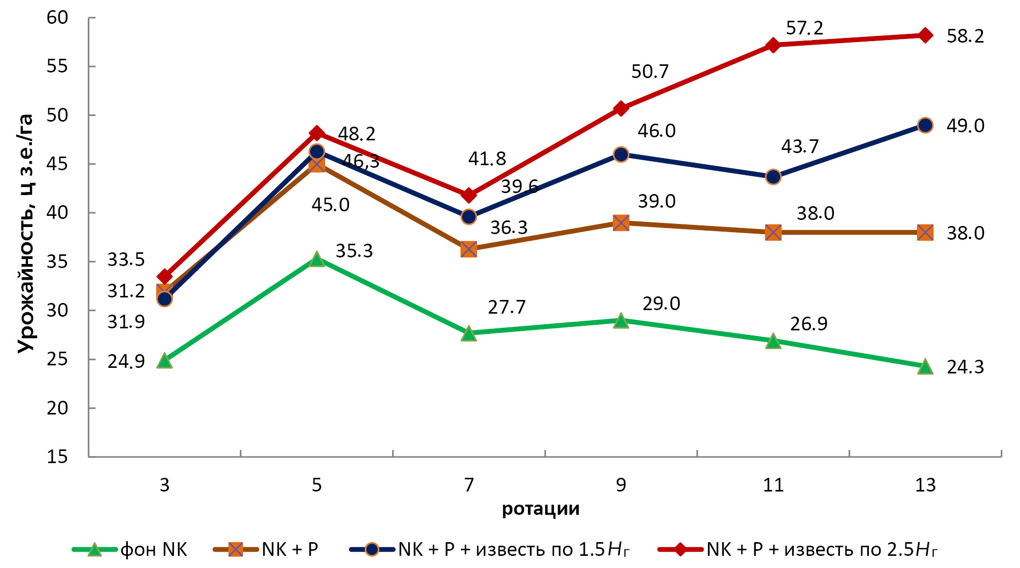 За 55-летний период ежегодное одностороннее применение азотно-калийных удобрений, несмотря на смену сортов на более интенсивные, не обеспечило последовательный рост их урожайности (рис. 1).