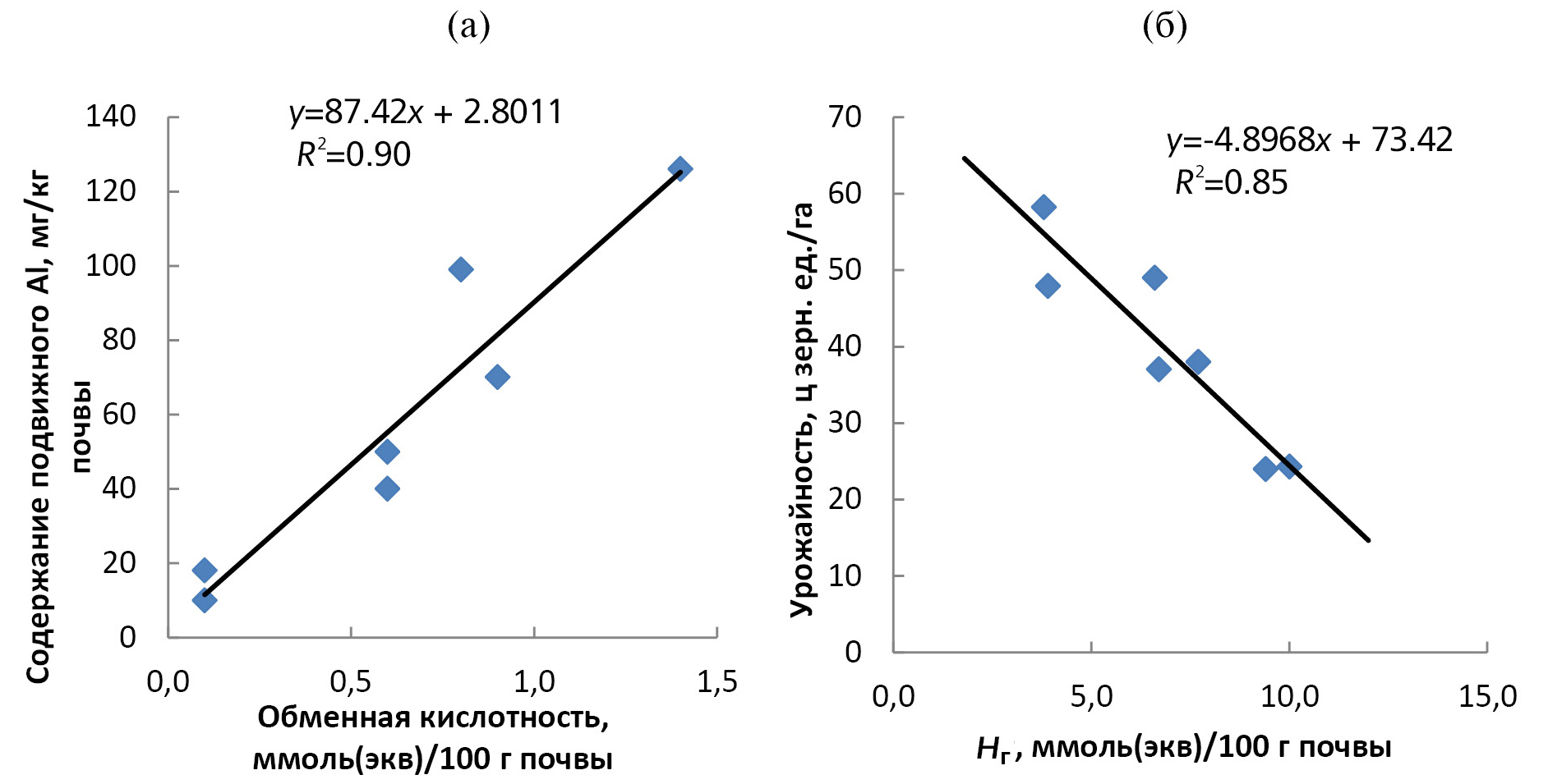 Именно поэтому при оценке парных коэффициентов корреляции наиболее сильная взаимосвязь урожайности сельскохозяйственных культур (озимой пшеницы и ярового ячменя) была обусловлена обменной и гидролитической кислотностью (табл. 1, рис. 2б). Например, с возрастанием показателя Нг на 1 ммоль урожайность зерновых культур снижалась на 4.9 ц/га.