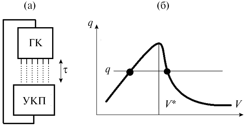 Рассматривается система, в которой жидкость из уловителя подается в ГК и возвращается с некоторой задержкой τ (рис. 1а). Текущий объем жидкости в уловителе равен V. Существует оптимальное значение V, равное V*, соответствующее максимуму расхода q через уловитель (вид зависимости q от V иллюстрирует рис. 1б). Расходу q и давлению на выходе уловителя p может соответствовать несколько значений V, т. е. учет степени заправки приводит к мультистабильности системы, а различные состояния ее равновесия обладают различными свойствами. Так, при внезапном увеличении расхода через ГК, произойдет увеличение объема жидкости в уловителе. Состояние с меньшим значением V оказывается устойчивым к такому возмущению; с большим – менее устойчивым. Одним из параметров, влияющих на устойчивость различных решений, является время задержки τ.