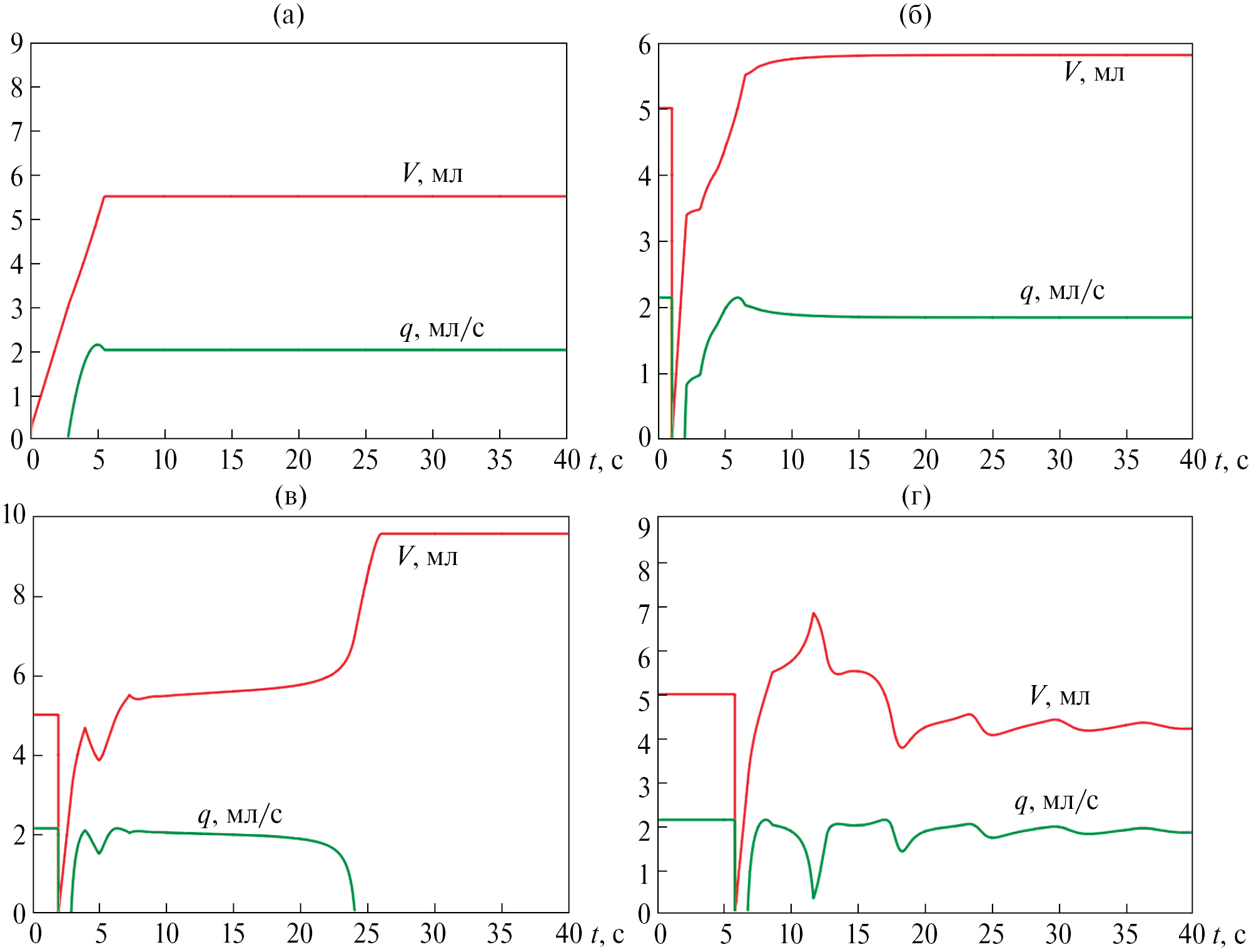 Численное моделирование решения системы (7) проводилось для следующих значений параметров: Pуm = 0.5 атм, Qуm = 45 мл/с, V* = 5 мл, К = 2 мл, γ = 4 мл/(с ⋅ атм). Величина τ была варьируемым параметром. В течение времени от 0 до τ предполагалось, что δV = 0, а расход имеет максимальное значение q0. В момент времени τ жидкость начинала истекать из генератора. Для компенсации уменьшения ее объема системе производился долив жидкости в УКП со скоростью qдолив = 1 мл/с. Долив прекращался при достижении значения V = kV* (k = 1.1).