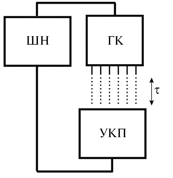 Рис. 3. Поясняющая блок-схема модели КХИ: УКП – уловитель капельного потока; ШН – шестеренный перекачивающий насос; ГК – генератор капель