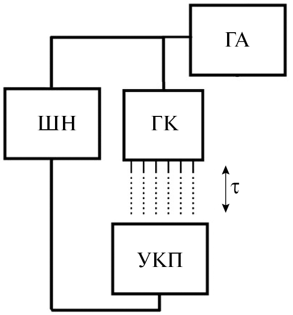 Рис. 6. Поясняющая блок-схема КХИ: УКП – уловитель капельного потока; ШН – перекачивающий насос; ГА – гидроаккумулятор; ГК – генератор капель