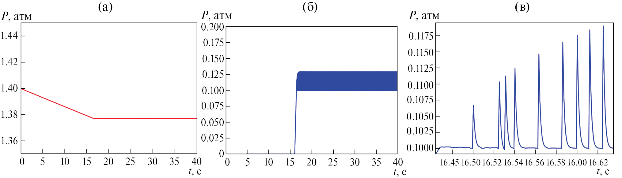 где p1, p2 – давление после уловителя и насоса соответственно. При проведении моделирования считалось, что Pнm = 10 атм, Qнm = 100 мл/с, γ = 1 мл/(с ⋅ атм), а τ = 4 с. Значения остальных параметров не изменялись.