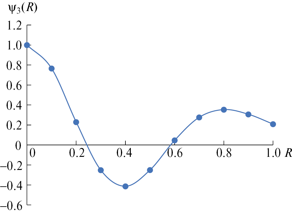 Рекомендуемое выражение (18) удовлетворяет с высокой степенью точности исходному дифференциальному уравнению (6) и полностью соответствует условию симметрии (7). Подставляя (18) в граничное условие (8), удается получить характеристическое уравнение для определения первого корня μ1. Необходимо отметить, что учет первых трех членов в правой части предлагаемого решения (18) позволяет определить функцию ψ1(R) с некоторым незначительным превышением, а расчет по полному выражению (18) характеризуется весьма малым занижением ψ1(R).