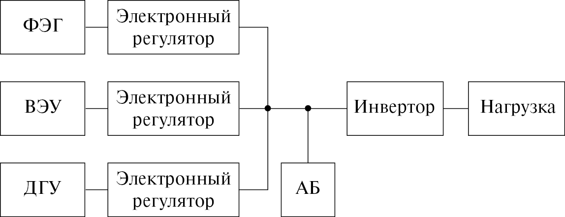 В структурной системе ГЭК с общей шиной постоянного тока (типа представленной на рис. 3) полная энергия, передаваемая в нагрузку, должна делиться между ВЭУ, ФЭГ, ДГУ в зависимости от вырабатываемой этими источниками энергии.