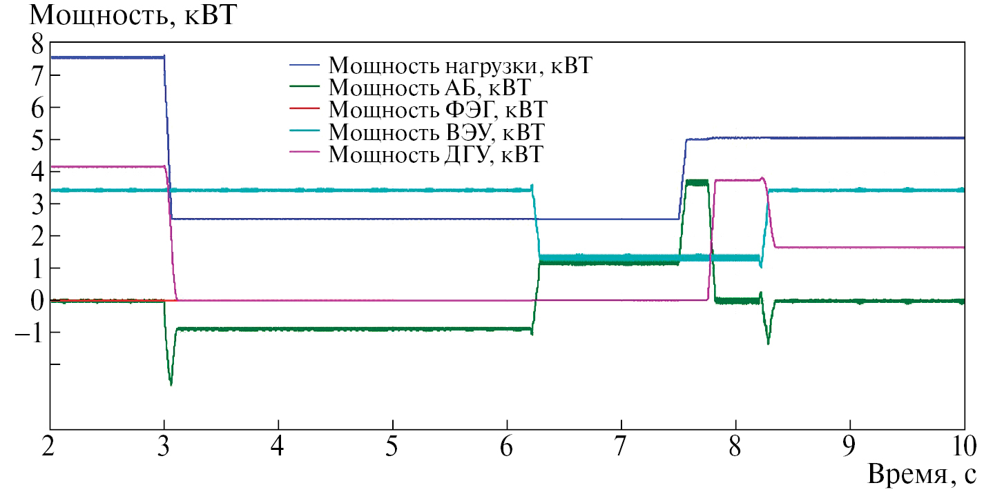 В этом опыте последовательность коммутации нагрузки выглядит следующим образом. В начальный момент времени суммарная мощность нагрузки составляет 7.5 кВт, в момент времени t = 3 с происходит отключение нагрузки и ее мощность снижается до 2.5 кВт, в момент времени t = 4 с происходит снижение генерации ФЭГ, в момент времени t = 6.3 с происходит снижение генерации ВЭУ, затем в момент времени t = 7.5 с происходит увеличение мощности нагрузки до 5 кВт, после чего в момент времени t = 8.3 с генерация ВЭУ восстанавливается на прежнем уровне.