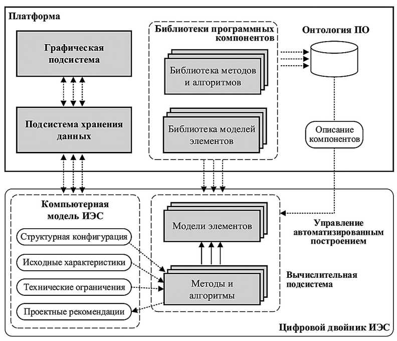 Предлагается программная платформа, разработанная на языке программирования Java, для использования в качестве единой основы автоматизированного построения цифрового двойника ИЭС. Архитектура программной платформы представлена на рис. 2. Она включает в себя следующие составляющие: